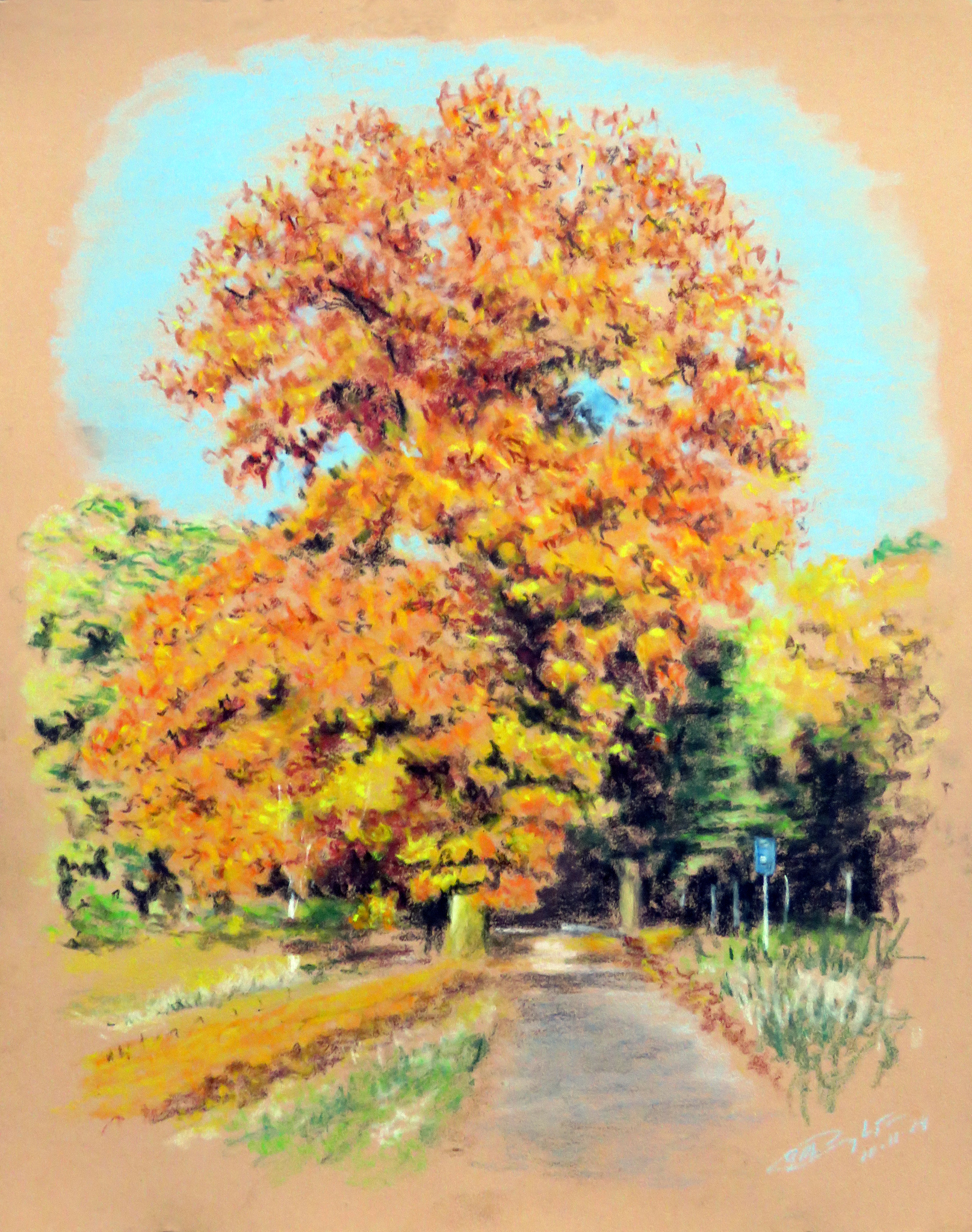 Op één van de mooie dagen in de herfst zagen we deze boom. Ik was getroffen door de mooie warme kleuren en wilde het eens met pastelpotloden proberen te vertalen.