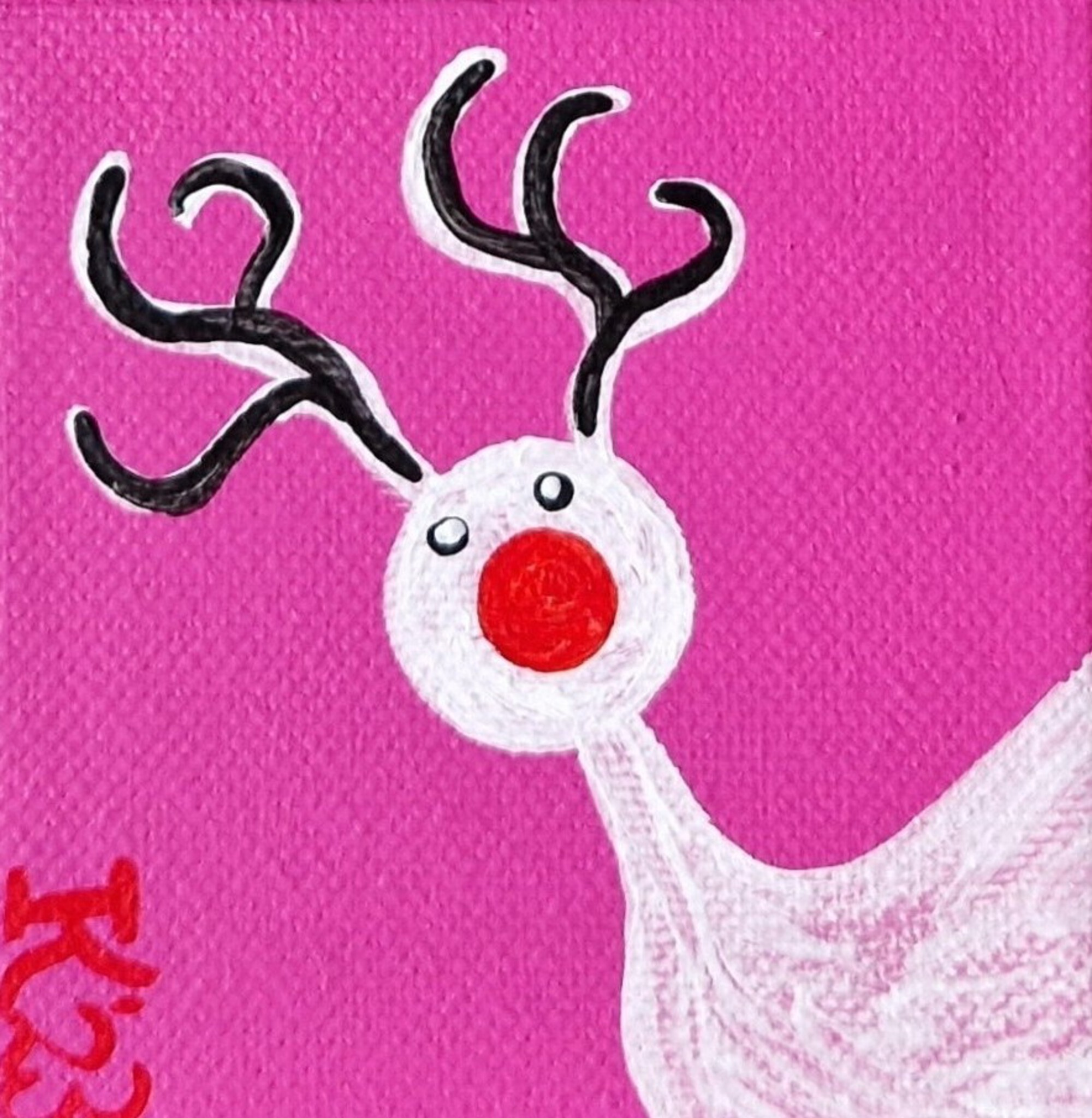 Decembercadeautje, verras jezelf of iemand anders met dit minischilderijtje, 7 bij 7 cm. Acrylverf op katoen, met een ophanghaakje aan de achterkant. November/december 2025; de prijs is inclusief decemberverpakking (rode achtergrond, met gouden sterretjes erop) en verzendkosten binnen Nederland (via Postnl).