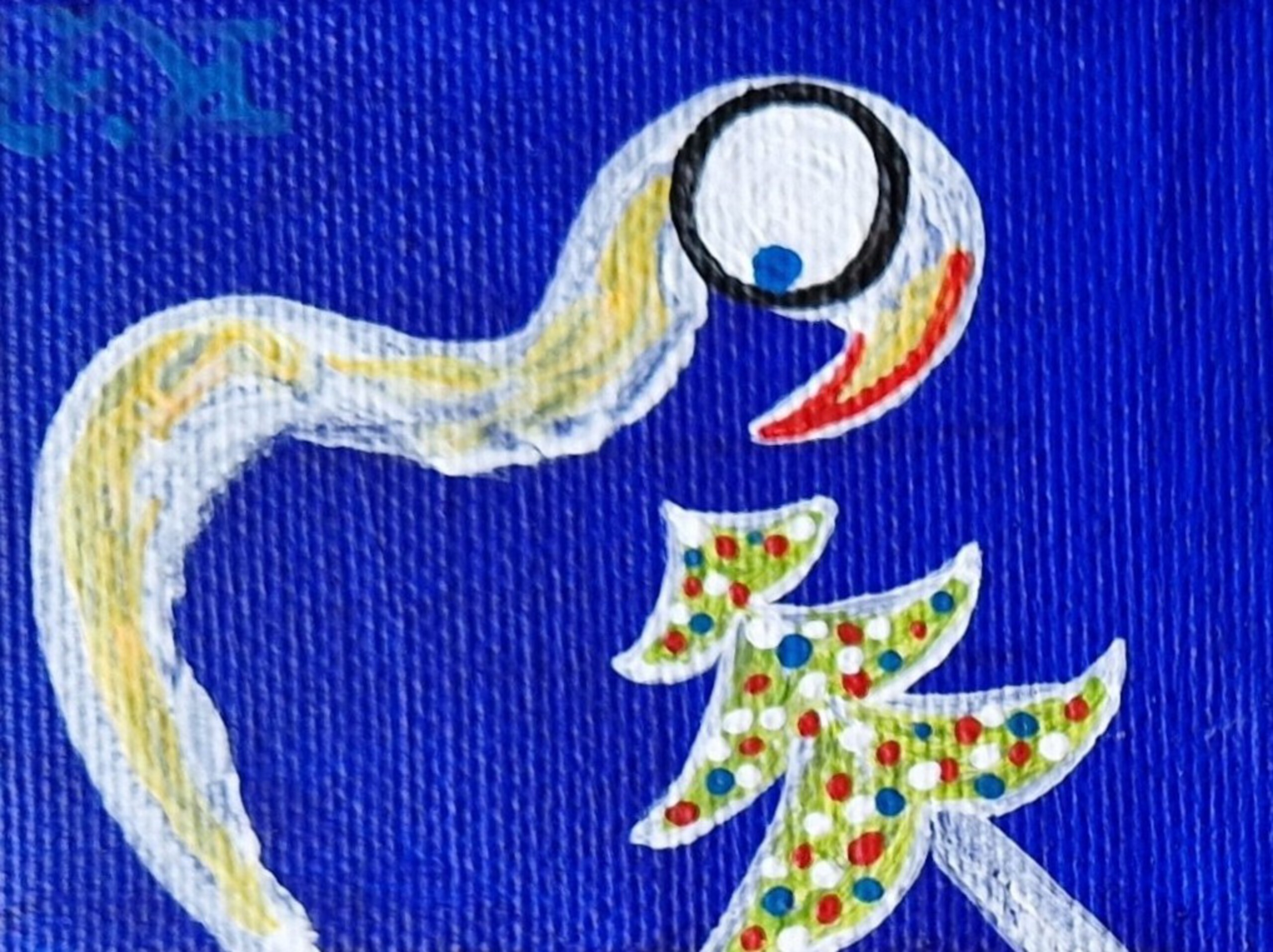 Decembercadeautje, verras jezelf of iemand anders met dit minischilderijtje, 6 bij 8 cm. Acrylverf op katoen, met een ophanghaakje aan de achterkant. November/december 2025; de prijs is inclusief decemberverpakking (rode achtergrond, met gouden sterretjes erop) en verzendkosten binnen Nederland (via Postnl).