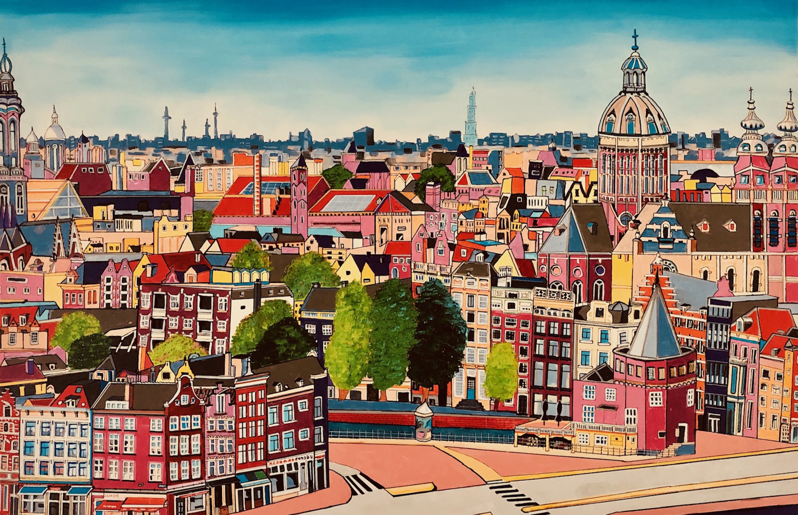 Gemaakt aan de hand van een foto die ik nam vanaf het dakterras van een modern kantoorgebouw aan de Amsterdamse Oostelijke Handelskade. De Wallen met o.a. de Schreierstoren en de Basiliek van de Heilige Nicolaas . Te koop als gecertificeerde reproductie op linnen.