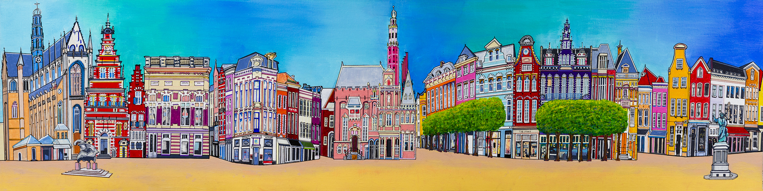 Een panorama met alle gebouwen die je tegen komt als je de Haarlemse Grote Markt bezoekt. Te koop als gecertificeerde reproductie op linnen.
