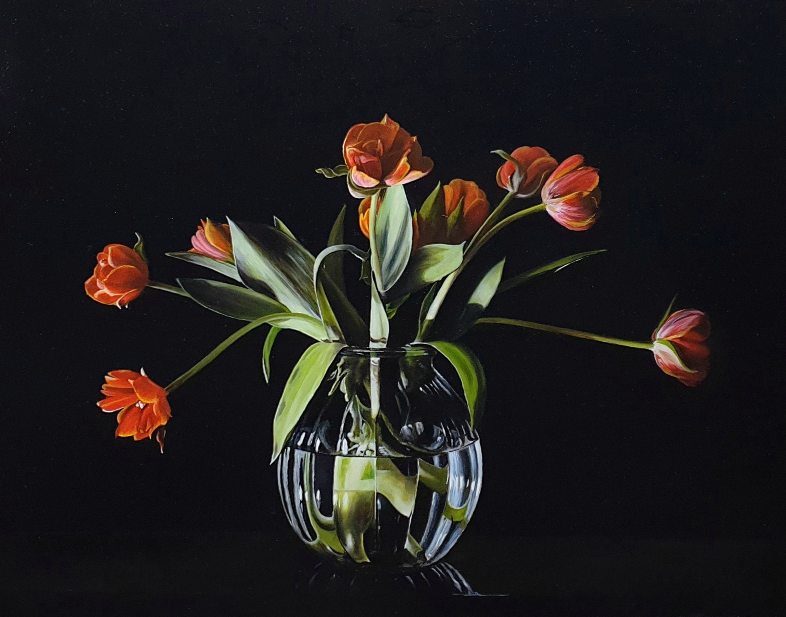 Tulpen in glazen vaas (naar foto Jaqueline Bleiker)