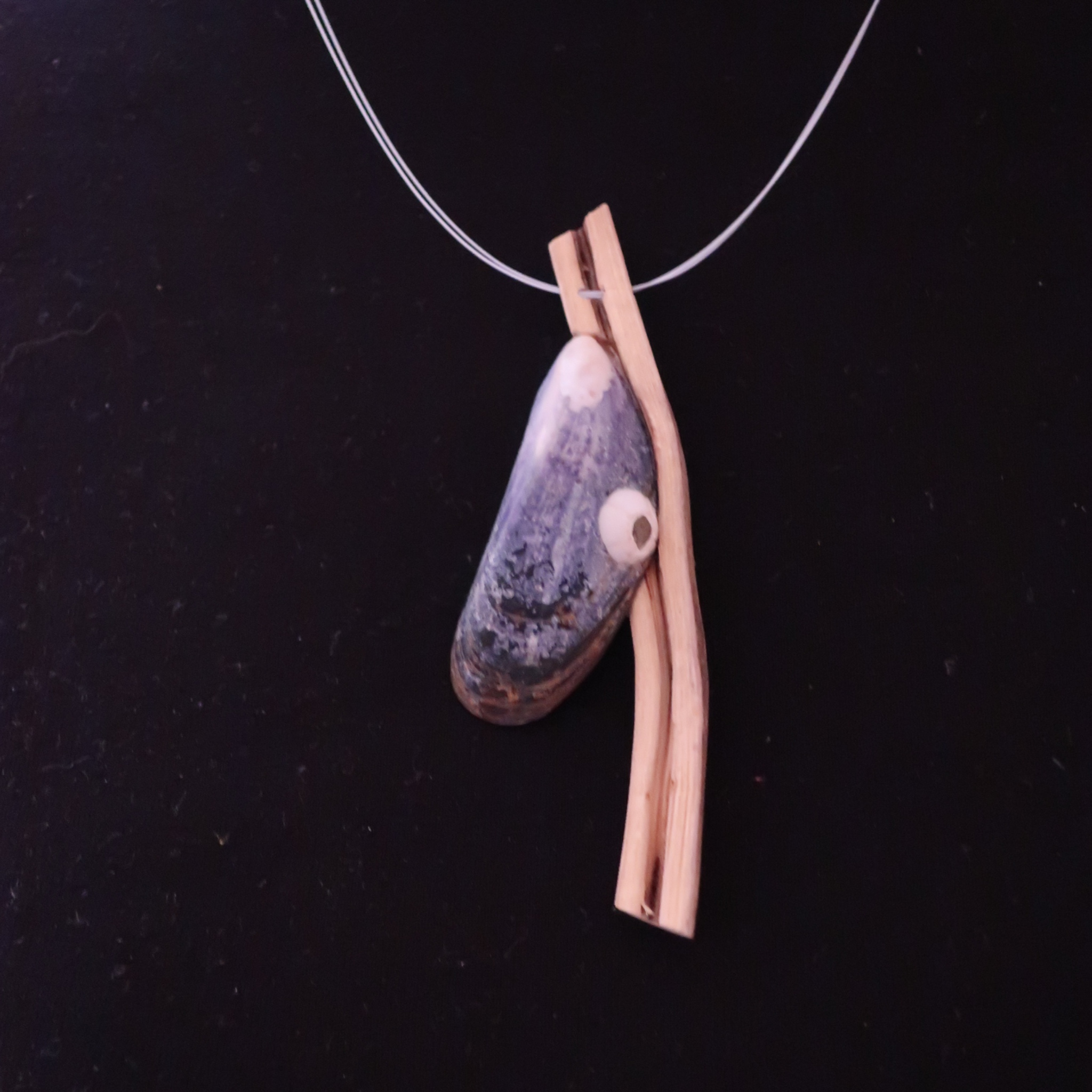 Je hebt schelpen en mooie schelpen. Onze blik valt er intussen bijna automatisch op. Een kleine, fijngetekende mosselschelp. Mossels hechten zich in trossen aan bijvoorbeeld touw. In dit geval wordt hij door ons aan een gesplitst hol takje bevestigd. Als spang een dubbele draad. In lengte verstelbaar en ook de glazen buiskralen kunnen schuiven en naar eigen inzicht een plekje op de spang krijgen.