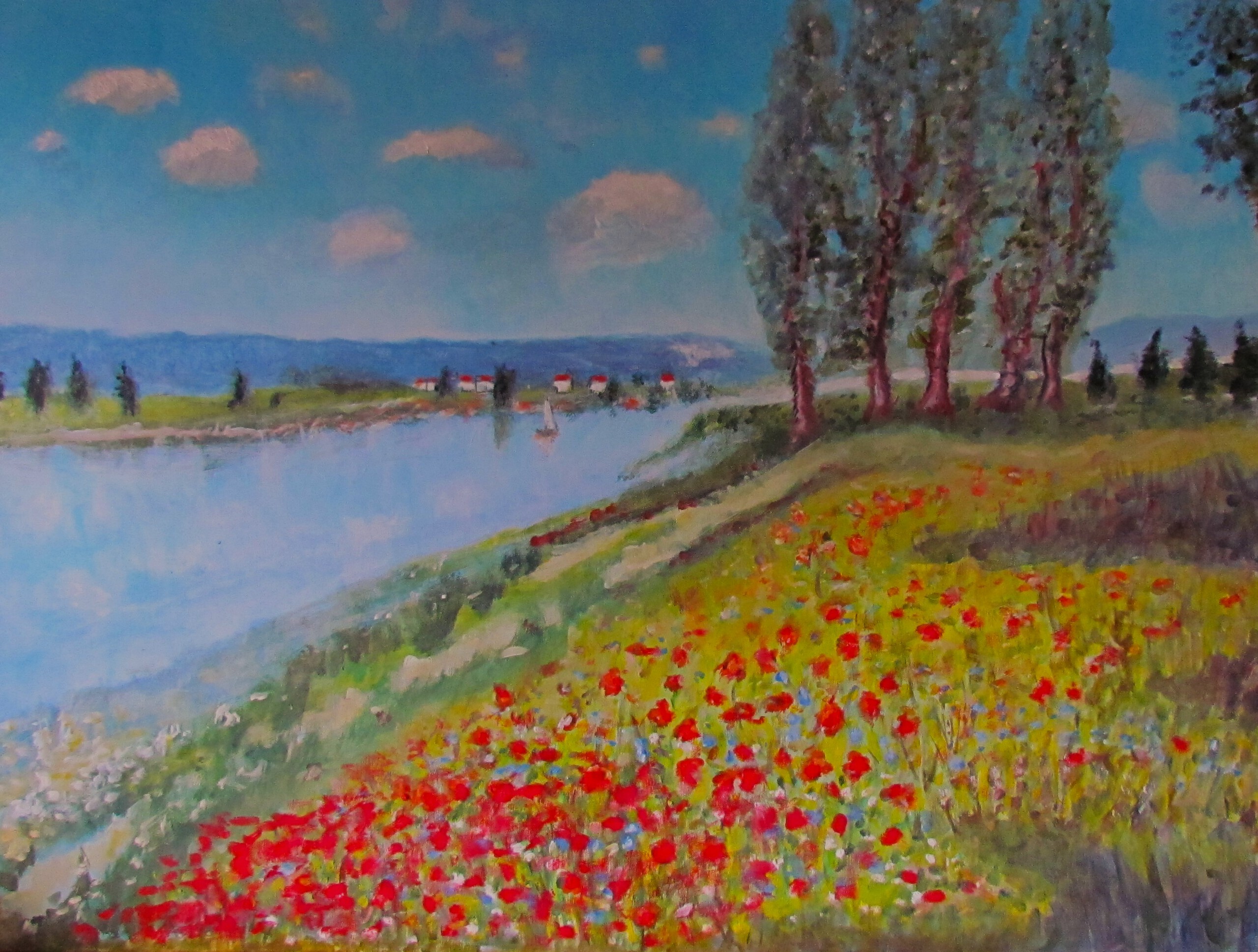 Rivierlandschap met klaprozen