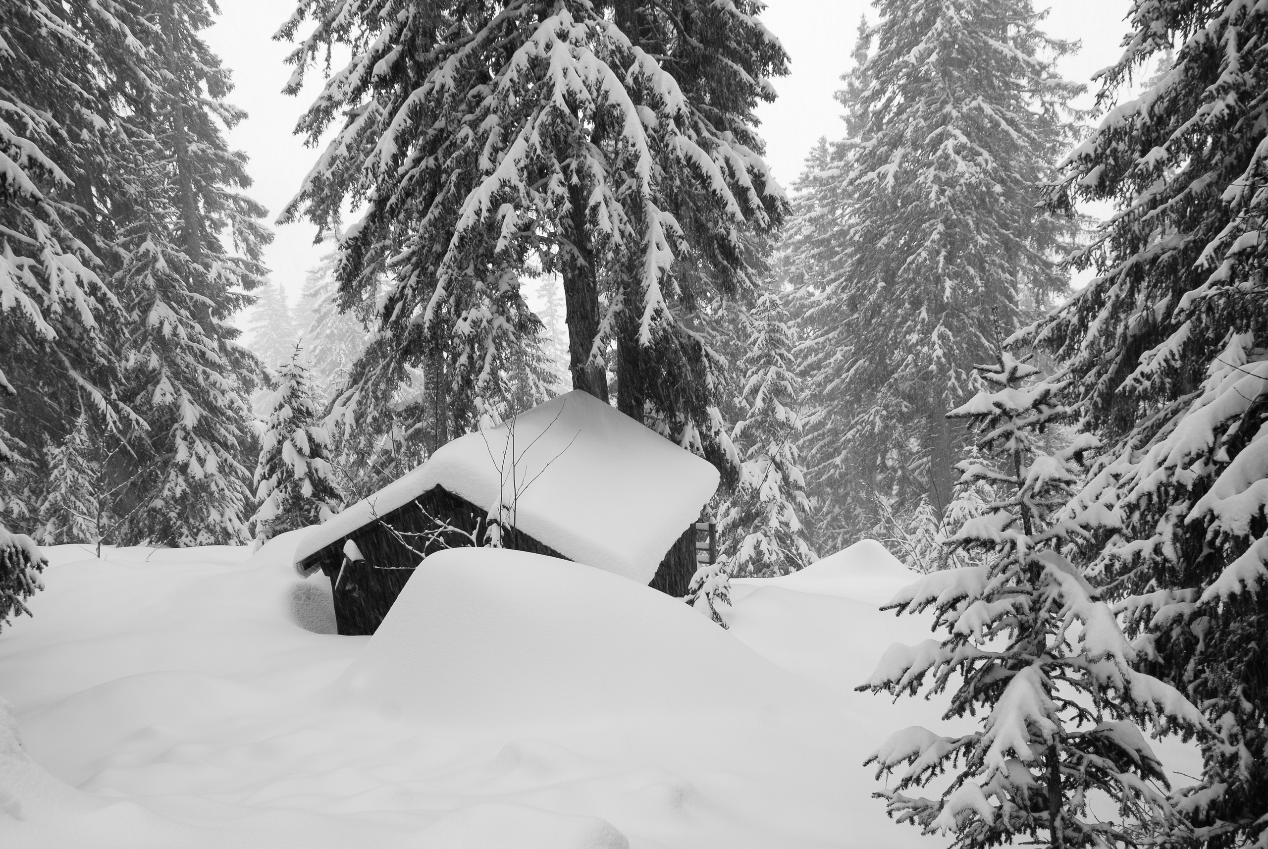 Hut Sneeuw Landschap Bedekt Bos Zwartwit