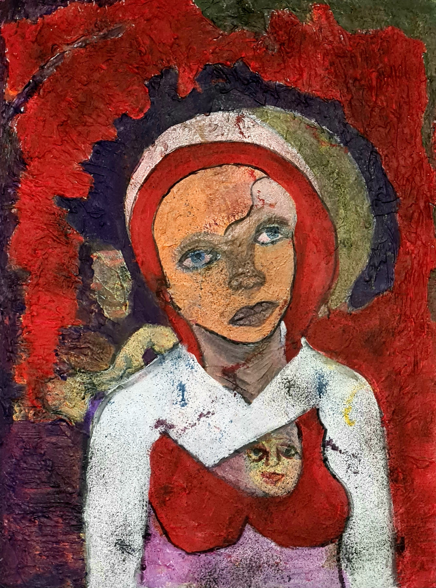 Het schilderij "Hypocritical" vangt een confronterend portret van een vrouw, omringd door intense rode en donkere tinten, alsof haar emoties uit haar lichaam spatten. Haar gezicht is doordrongen van kwetsbaarheid, met ogen die de kijker aanstaren alsof ze hen probeert te doorgronden. Maar daaronder, in het gebied waar haar hart zou moeten zitten, verschijnt een tweede gezicht, klein en angstaanjagend vreedzaam. Dit contrast roept een diep gevoel van ongemak op: wie is zij werkelijk?