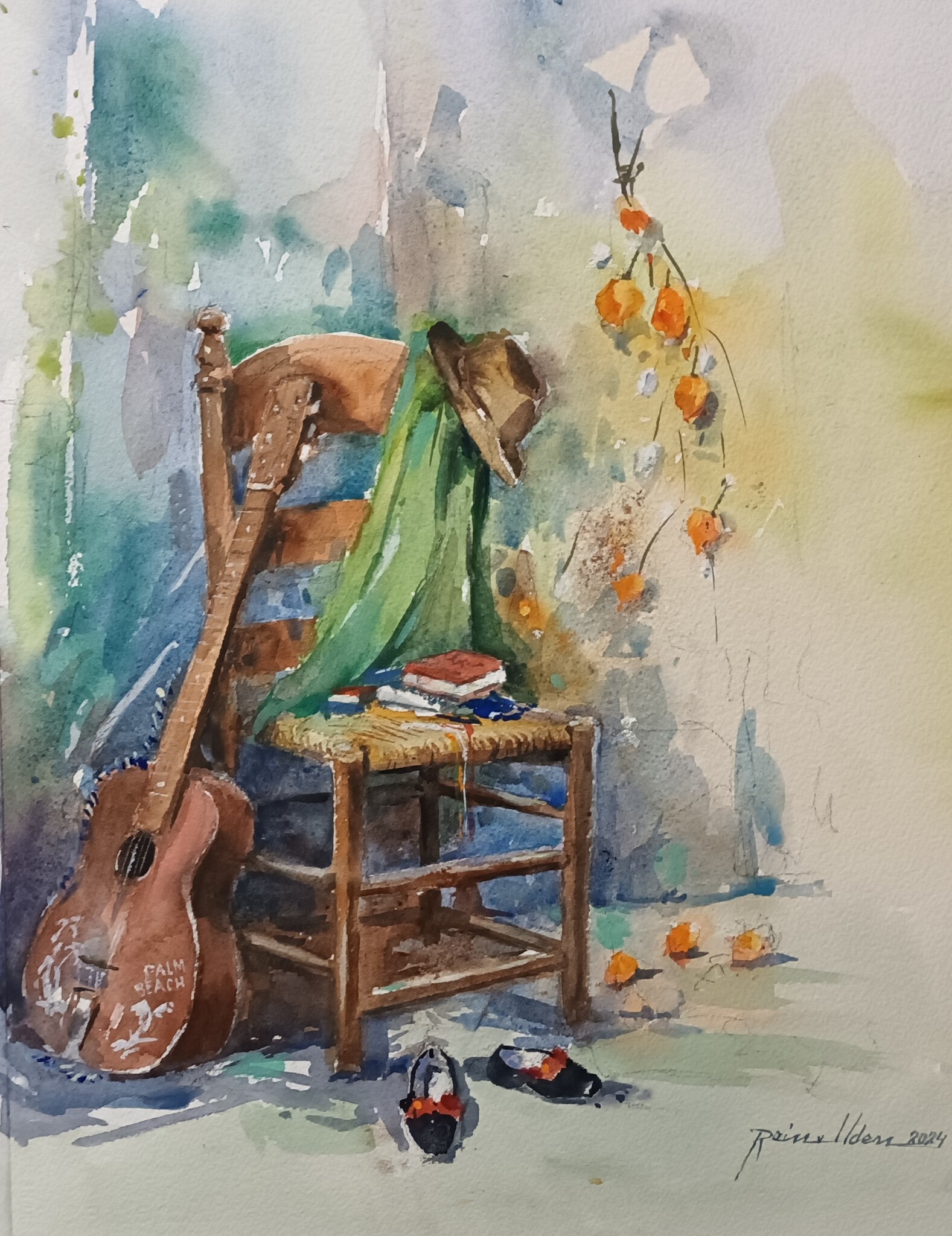 Aquarel met oude stoel en mijn gitaar, naar een schilderij van Dorus van Oorschot mijn leermeester. Als aandenking aan onze muziekgroep The Distelstars.