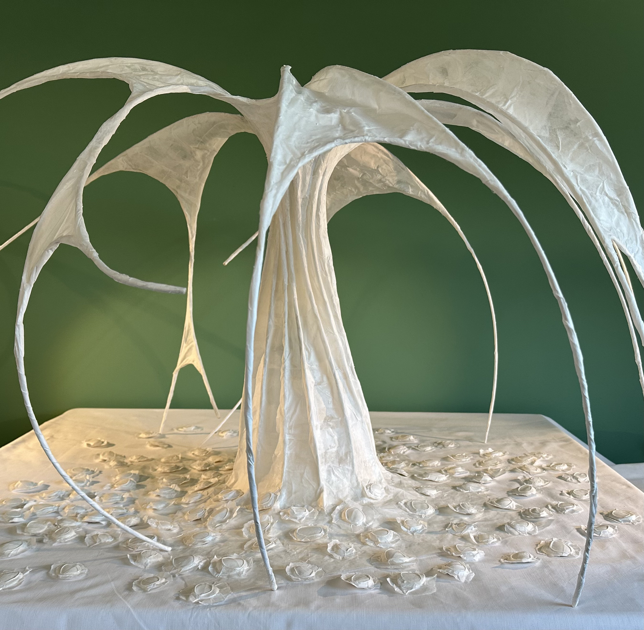 boom van papier en pitriet met takken die weer naar de grond groeien om de wortels te ontmoeten op de bodem liggen stukjes porselein met levenslijnen zoals bladeren in de herfst zij voeden de boom met eigen energie, de cirkel van het leven