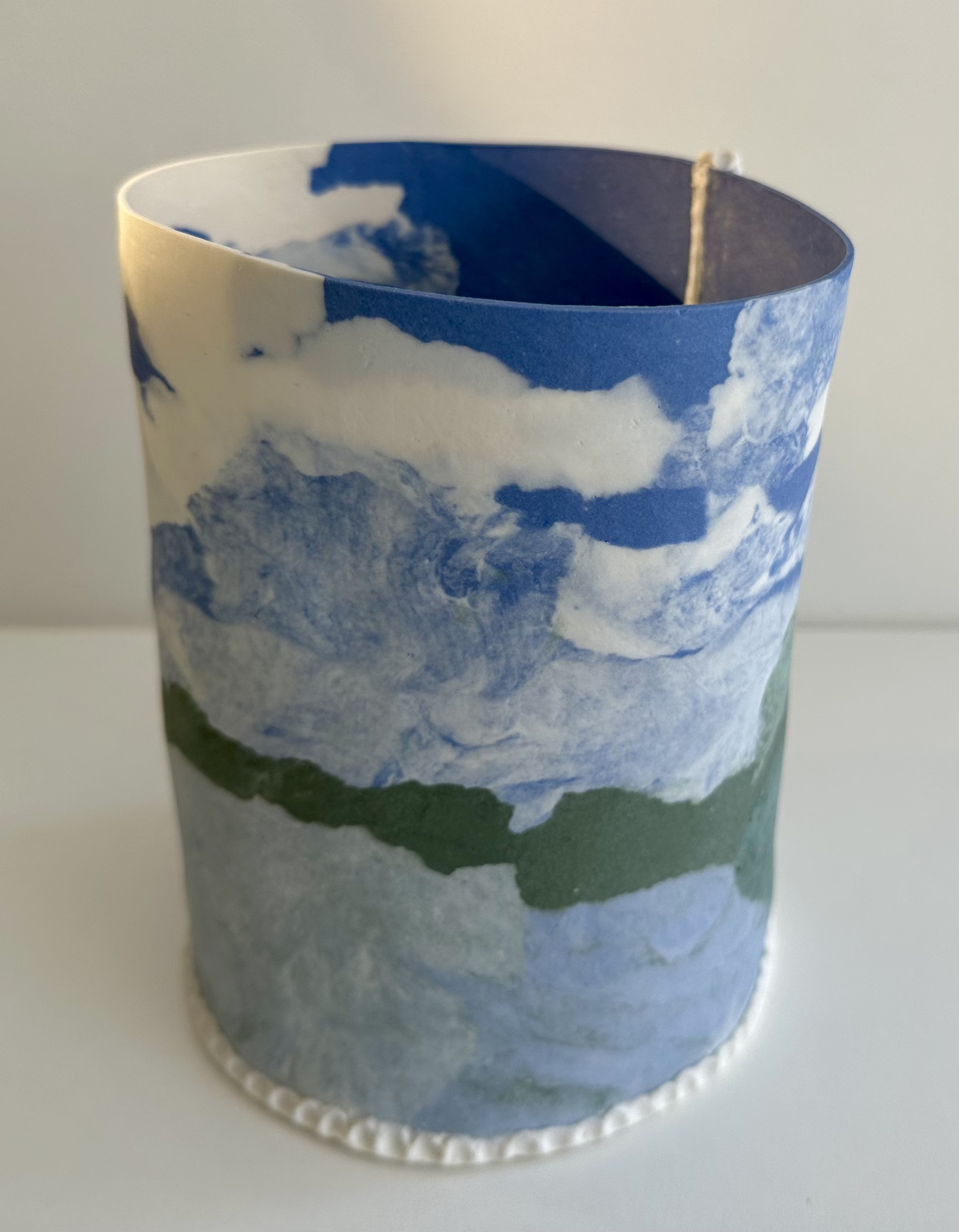 porseleinen cilinder met als decoratie een waarneming van mooie zonnige dag met veel wind en een steeds veranderende lucht en daarmee ook veranderende weerspiegeling in het water.
