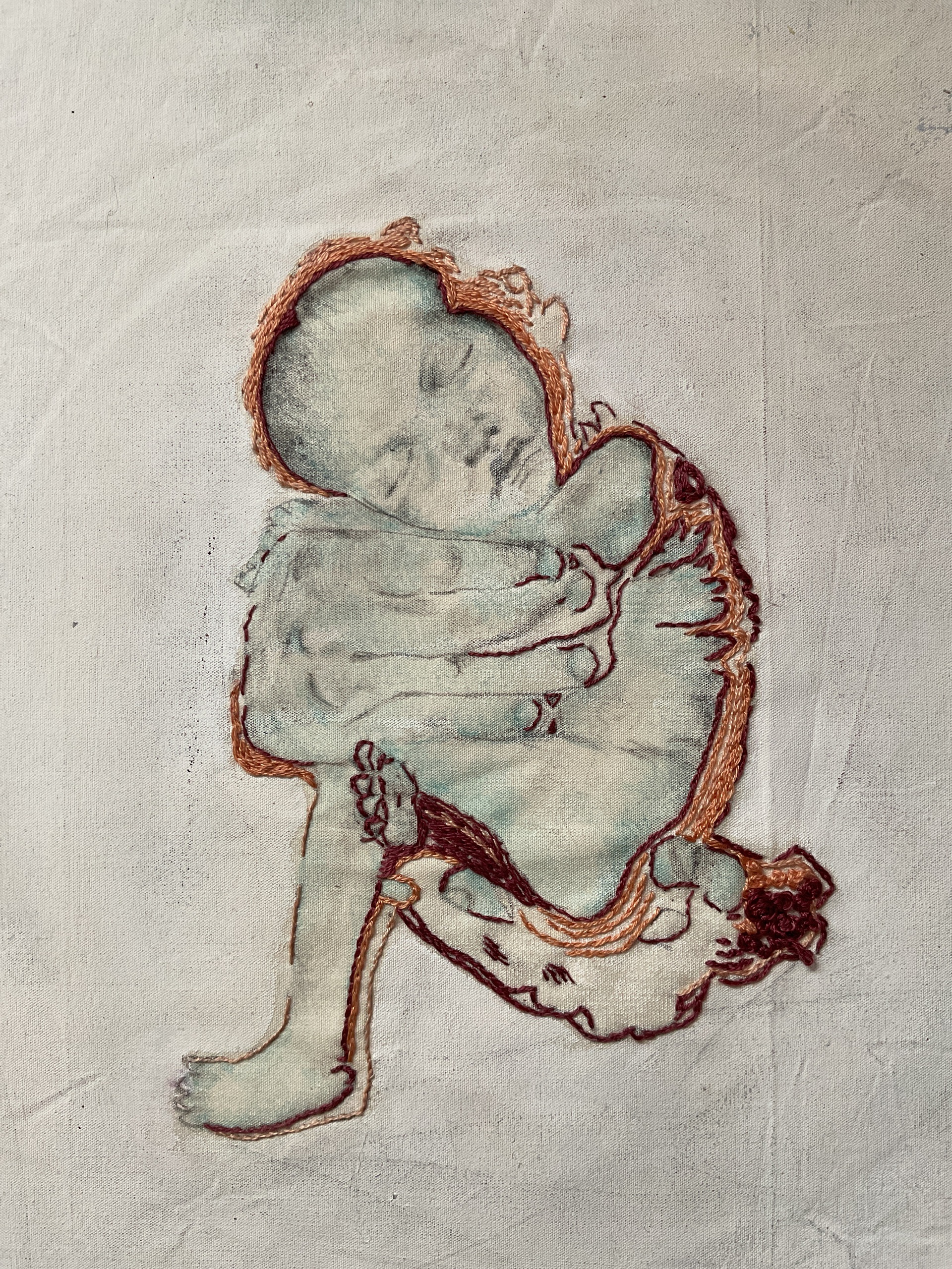 Vanuit de moederschoot gedragen in liefde ontvangen. tekening op katoen met borduursteken