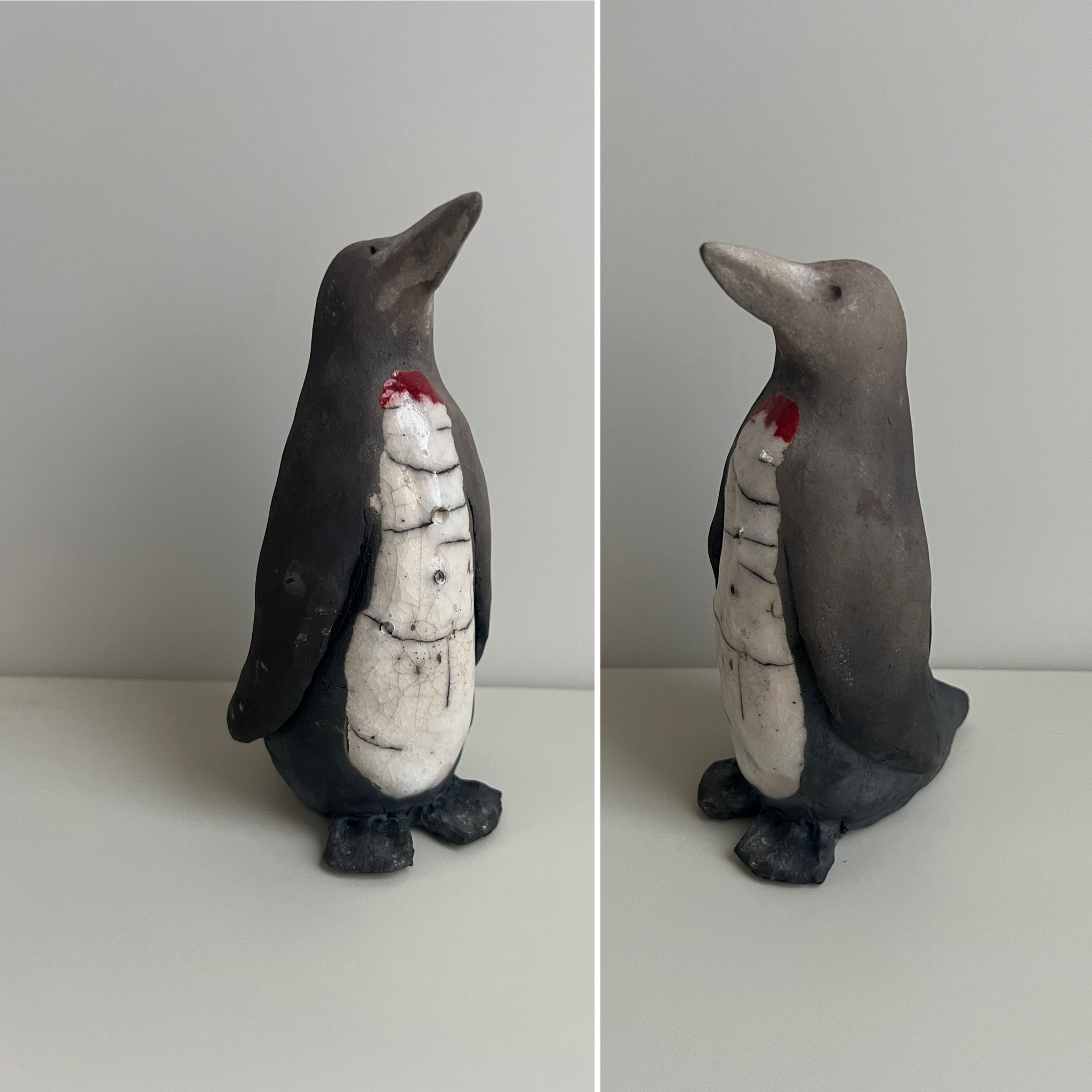 Raku-gestookte pinguïn. Ik vind raku nog steeds het mooiste, vooral wanneer je de zwartgerookte klei naast het witte, gecraqueleerde glazuur ziet. Op de foto is de linker- en rechterkant te zien.