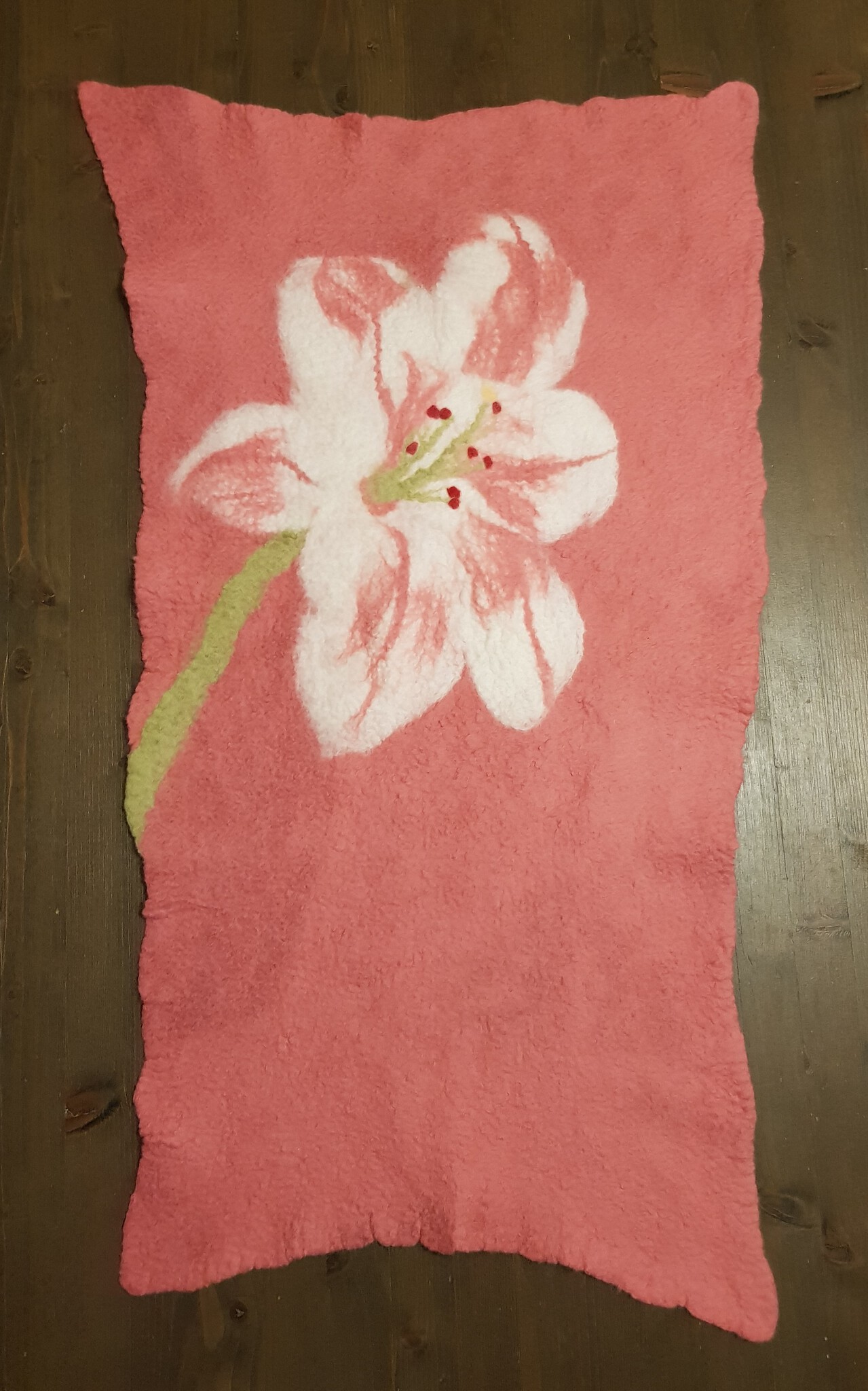 De lelie is het symbool van zuiverheid van de ziel, onschuld, liefde, wedergeboorte. De kleur roze verwijst naar het vrouwelijke. Het kleedje kan over de kist gelegd worden. Na de uitvaartdienst kan het in het interieur op de rand van de bank gelegd worden.