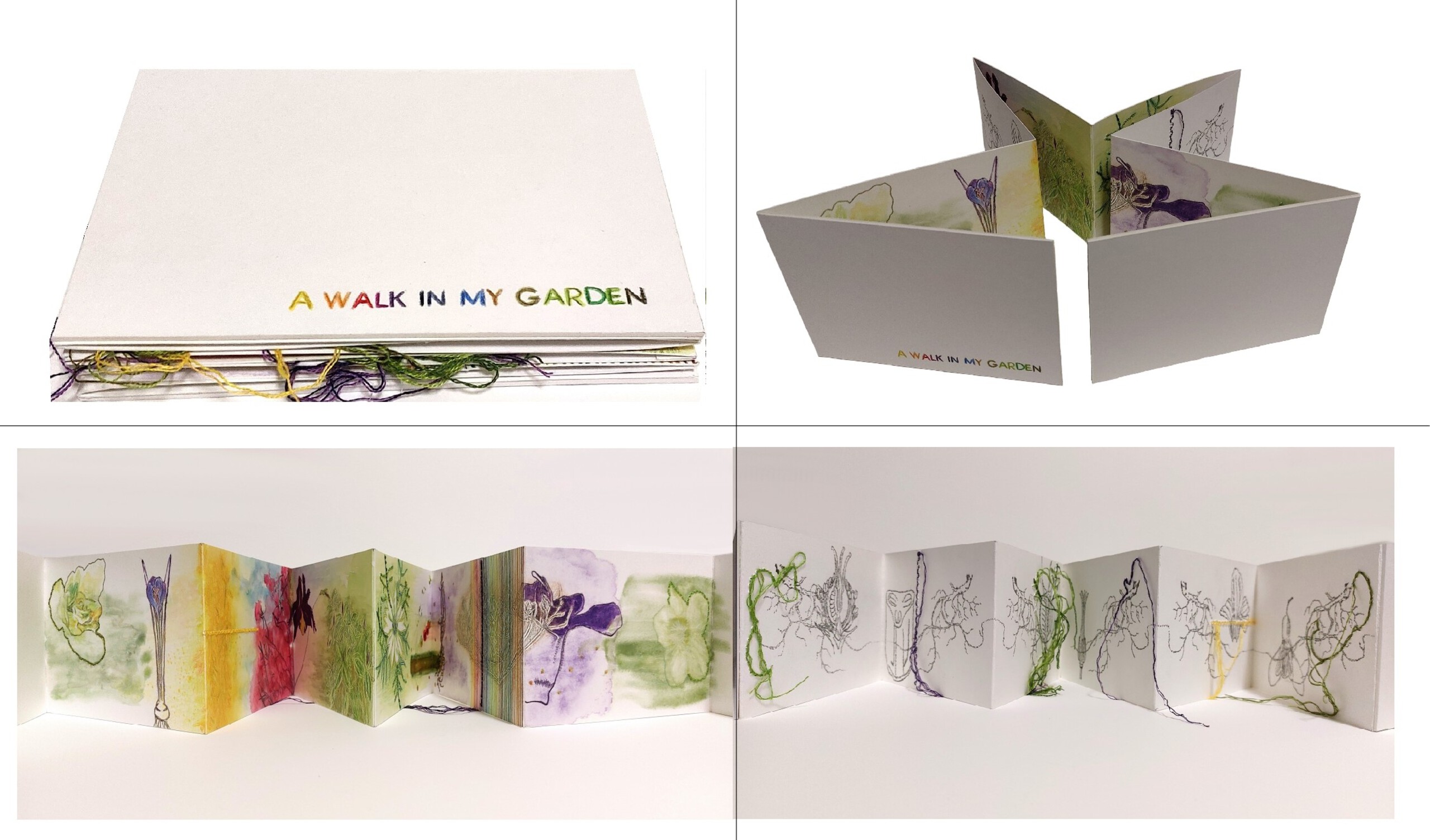 Leporello, concertina, harmonica, zigzagboek, aquarelpotlood, potlood, borduurgaren op papier