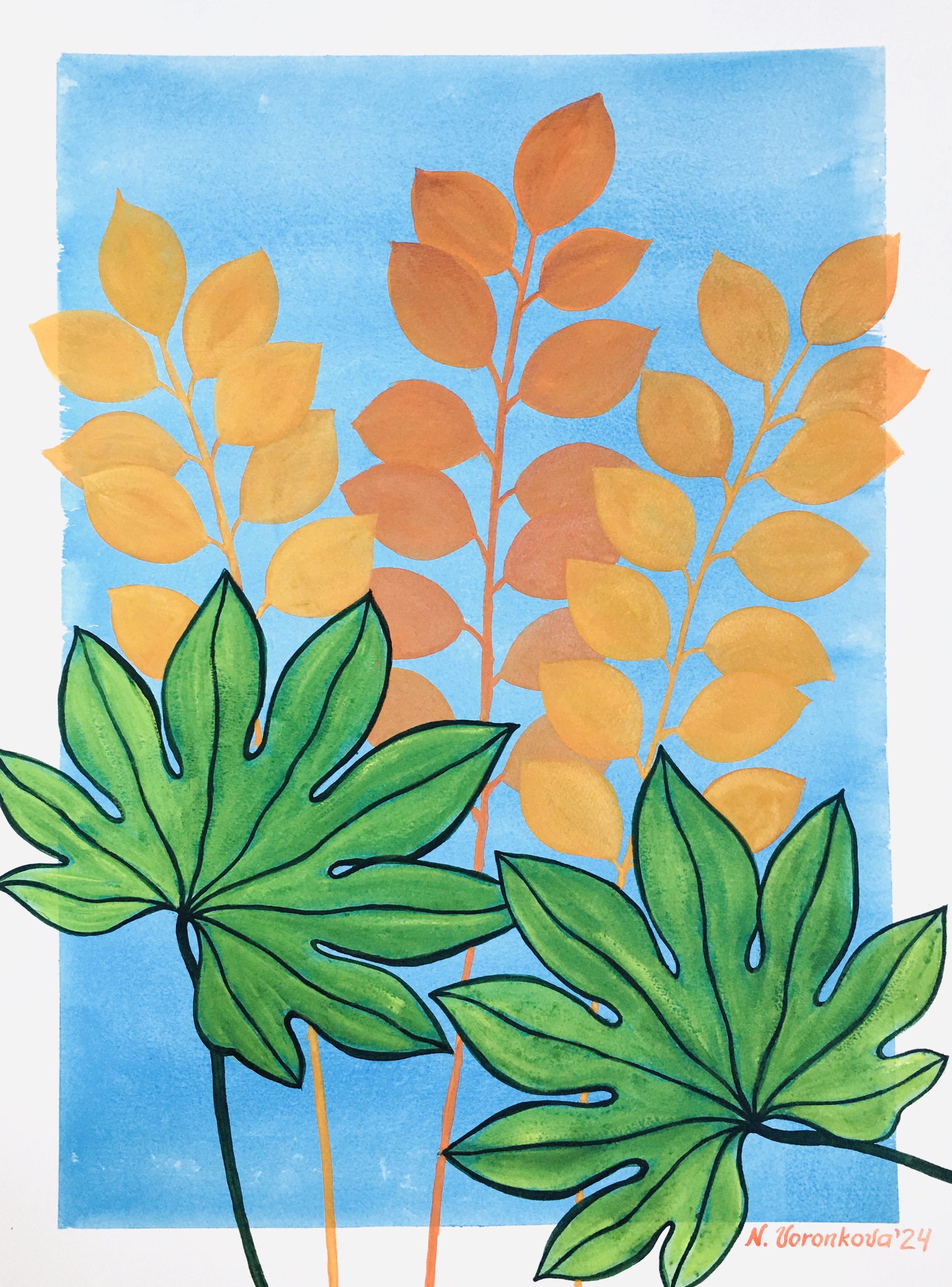 Aquarelschilderij, 2024 Deze kleurrijke aquarelillustratie toont een levendige compositie van tropische bladeren. Op de voorgrond staan drie grote groene bladeren met zwarte contourlijnen, die scherp contrasteren met de achtergrond. Daarachter zijn oranje en goudgele bladtakken afgebeeld, geschilderd in warme tinten. De heldere blauwe achtergrond geeft een frisse en zomerse sfeer. De combinatie van felle kleuren en strakke lijnen maakt het geheel modern en energiek.