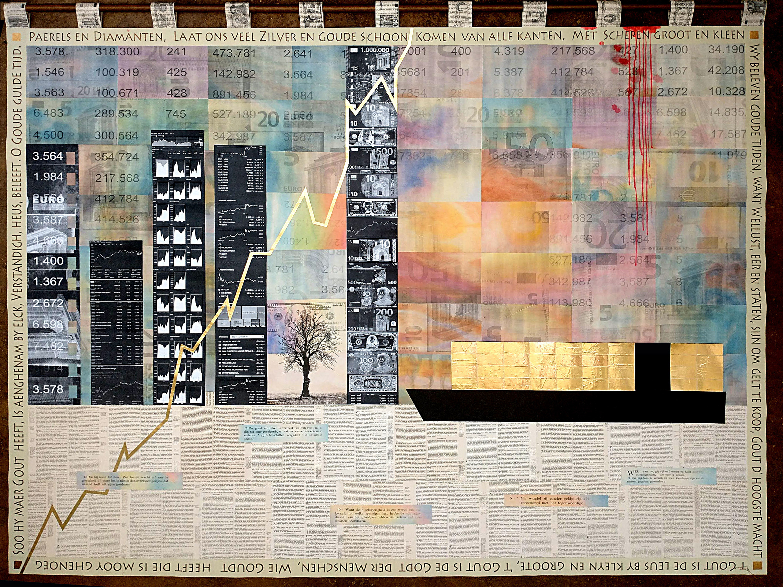 Is er zoveel veranderd sinds VOC 1.0? Papierbanier, de randtekst is afkomstig uit een 17e eeuws hekeldicht. Als ondergrond dienen deels bladzijden uit een oude bijbel. De VOC en de ontdekkingsreizen in de tijd van Columbus hebben ons rijk gemaakt, maar de hebzucht in de huidige neoliberalistische wereld is er niet minder om geworden.