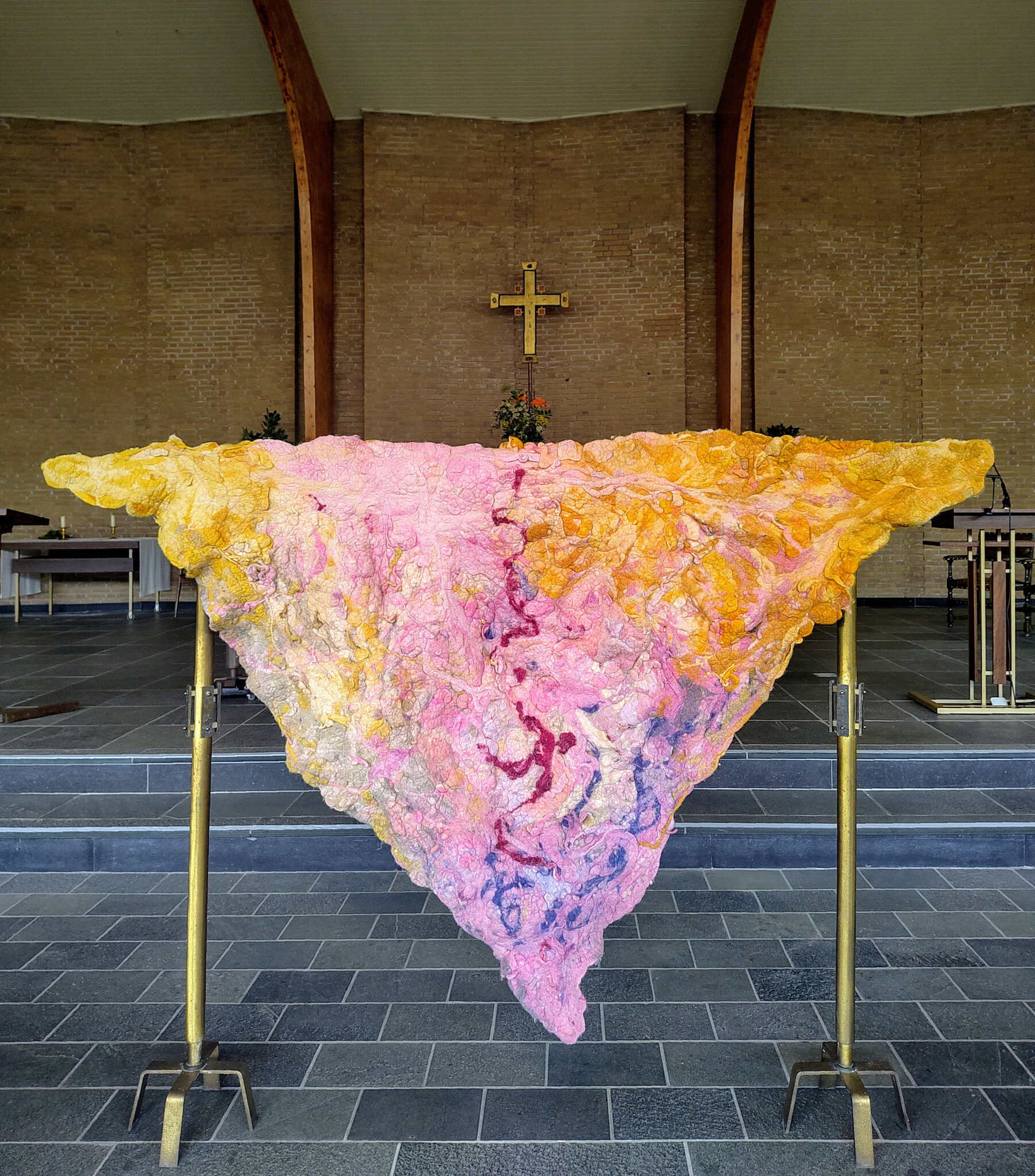 Voor de expositie Feest van de Geest maakte ik gezamelijk met 3 parochianen uit 3 fuserende katholieke kerken dit natuurlijke geverfde en hand gevilte Troostkleed. Als troost voor de 3 kerken die nu een worden, en waarvan twee kerken uit functie zijn gegaan.