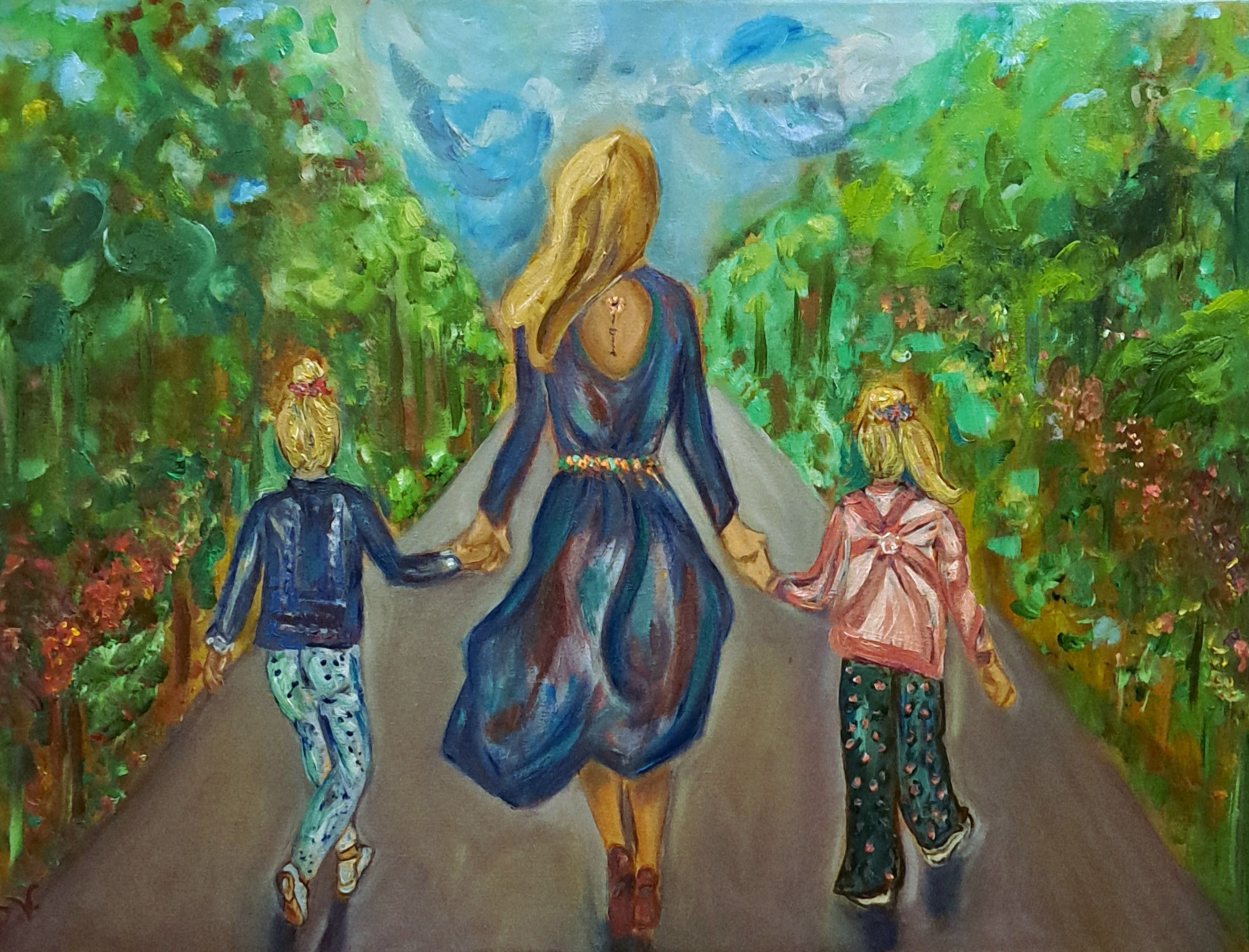 Moeder 2 Kinderen Groen Blauw Olieverf