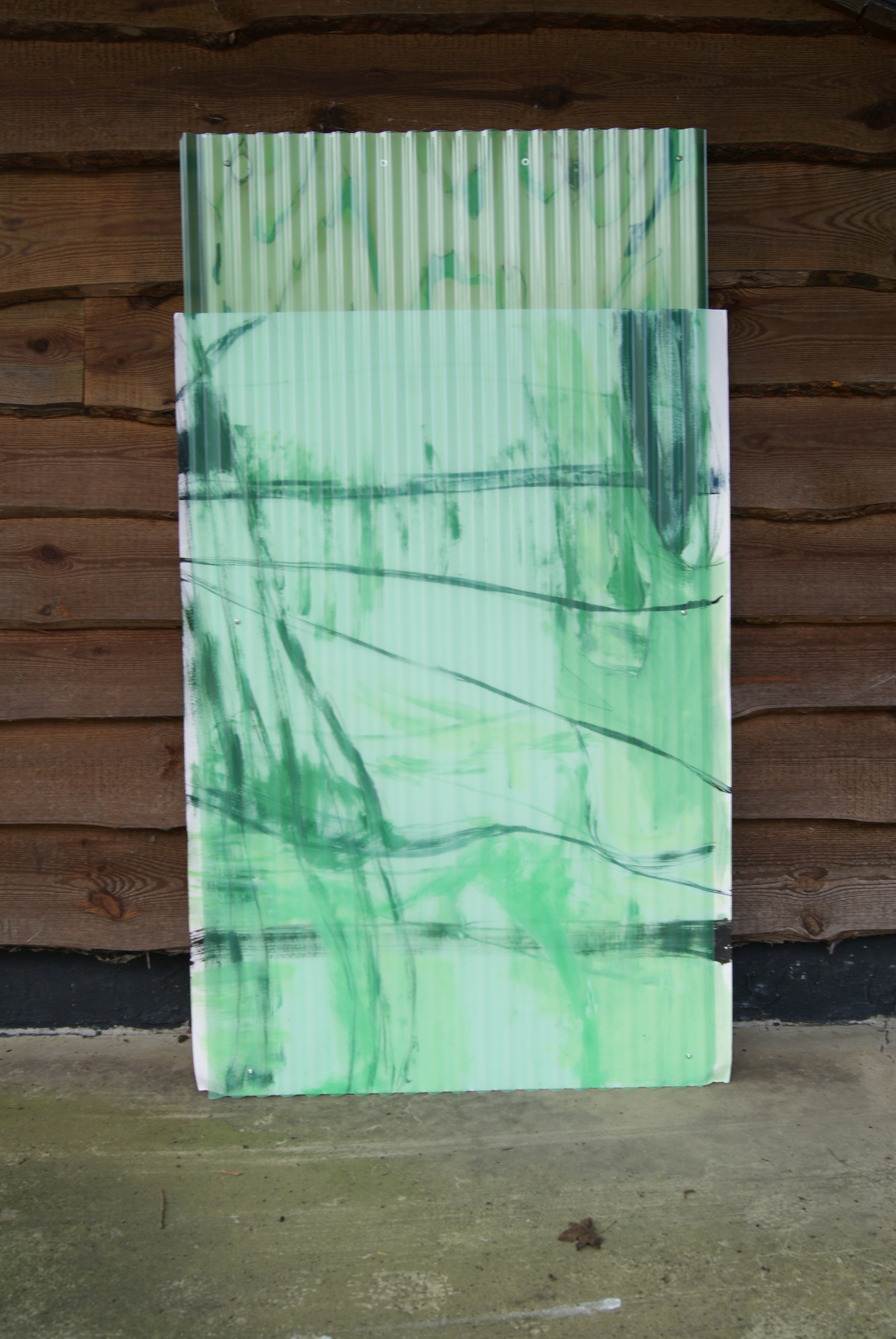 Plastic corrugated green sheet, paper, acrylic paint, charcoal, wood