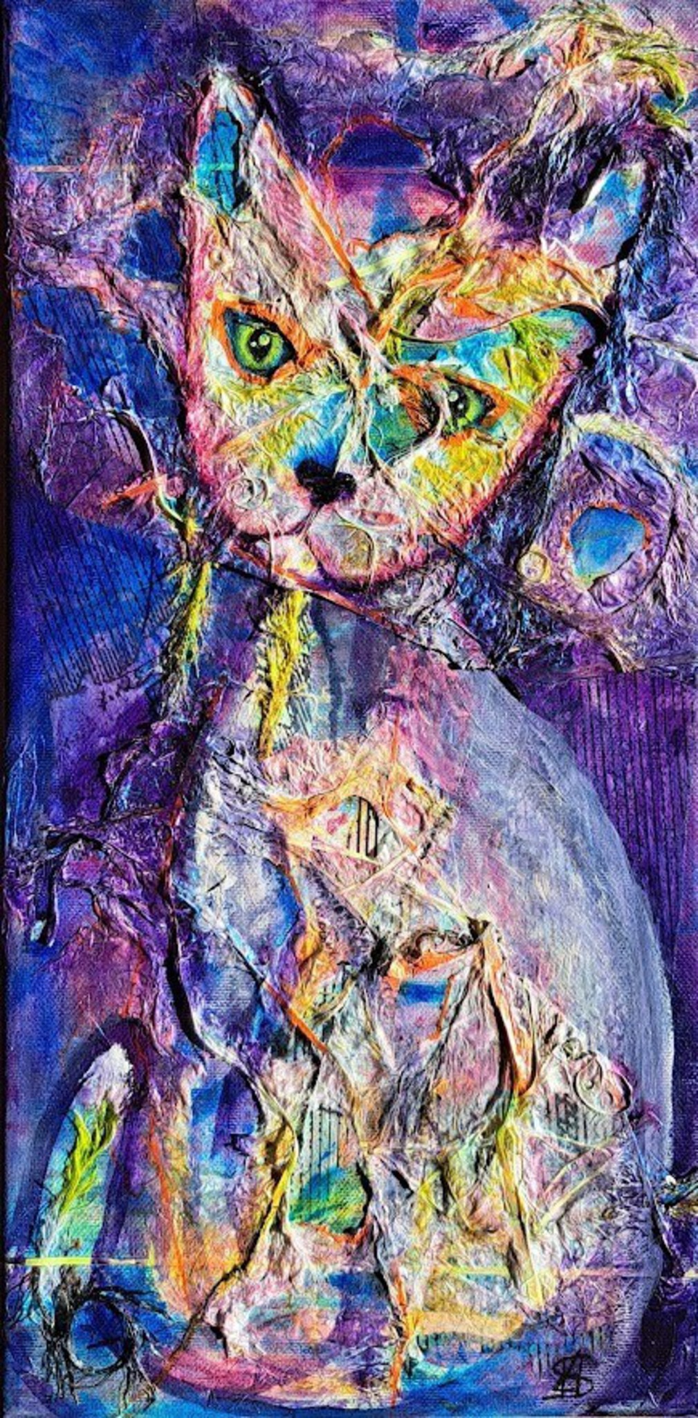 Een prachtig experiment met allerlei verschillende materialen drukte zich uiteindelijk uit in de poes van de buren, die vond dat de baasjes maar eens thuis moesten komen van vakantie. Acryl mixed media op doek. 20x 40cm.