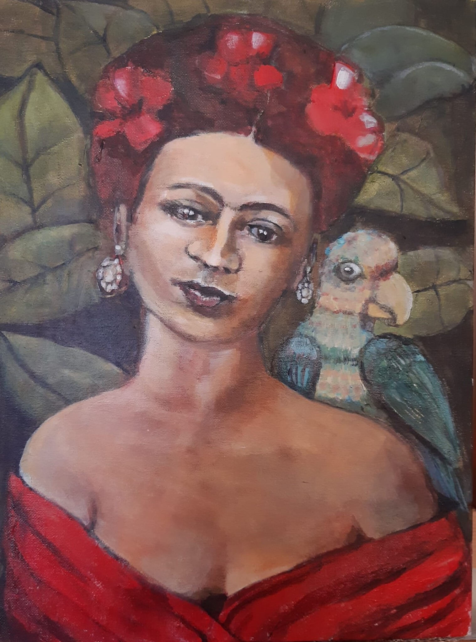 Acrylverf op canvas paneel. Formaat 30 by 40 cm. In de serie Frida-schilderijen in acrylverf, nummer vier. Geïnspireerd op leven en werk van Frida Kahlo.