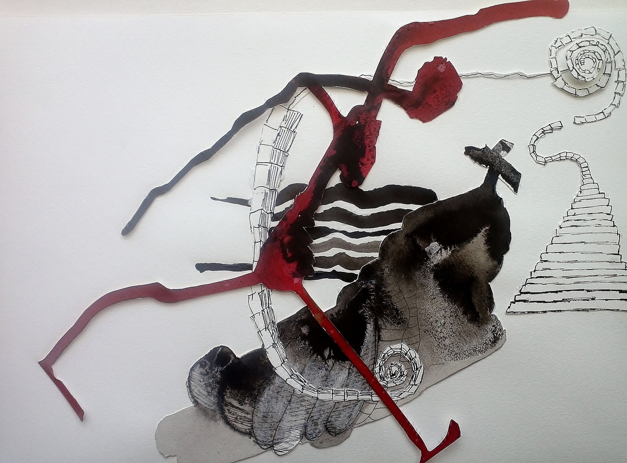 Collage van pentekeningen en tekeningen van gewassen inkt. Zwart, donkerrood. Over het leven en de dood.