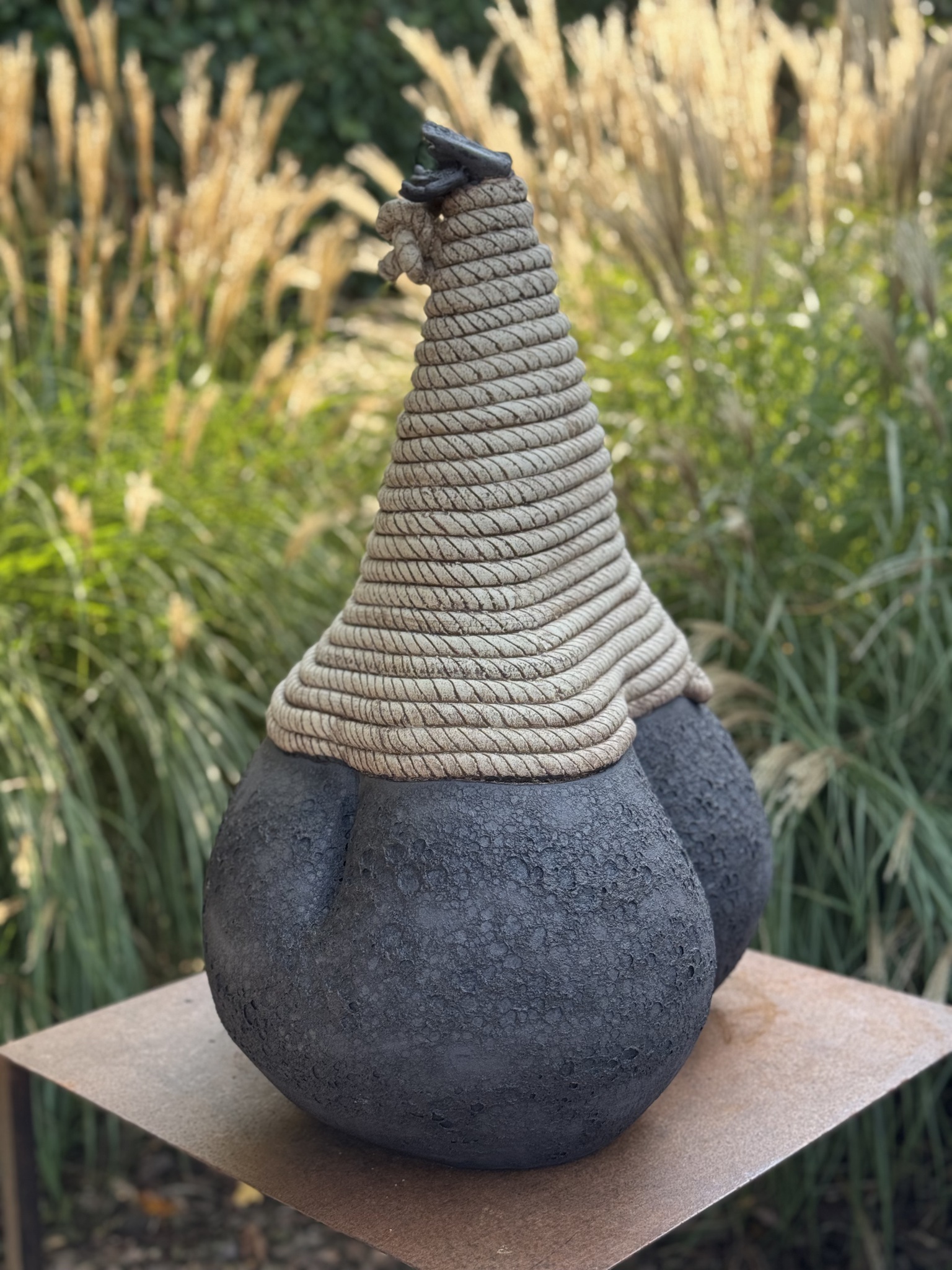 Gekneveld Chris cracco Keramiek, 2024 Strak gewonden touw omhult een vorm die balanceert tussen kracht en kwetsbaarheid. De donkere, zware basis contrasteert met het ritmisch opgebouwde bovenlijf — een lichaam zonder stem, gevangen in zijn eigen vorm. Met Gekneveld stelt de kunstenaar vragen over macht, controle en innerlijke druk. Het werk nodigt uit tot reflectie: wat gebeurt er als we niet meer kunnen spreken, bewegen of kiezen?