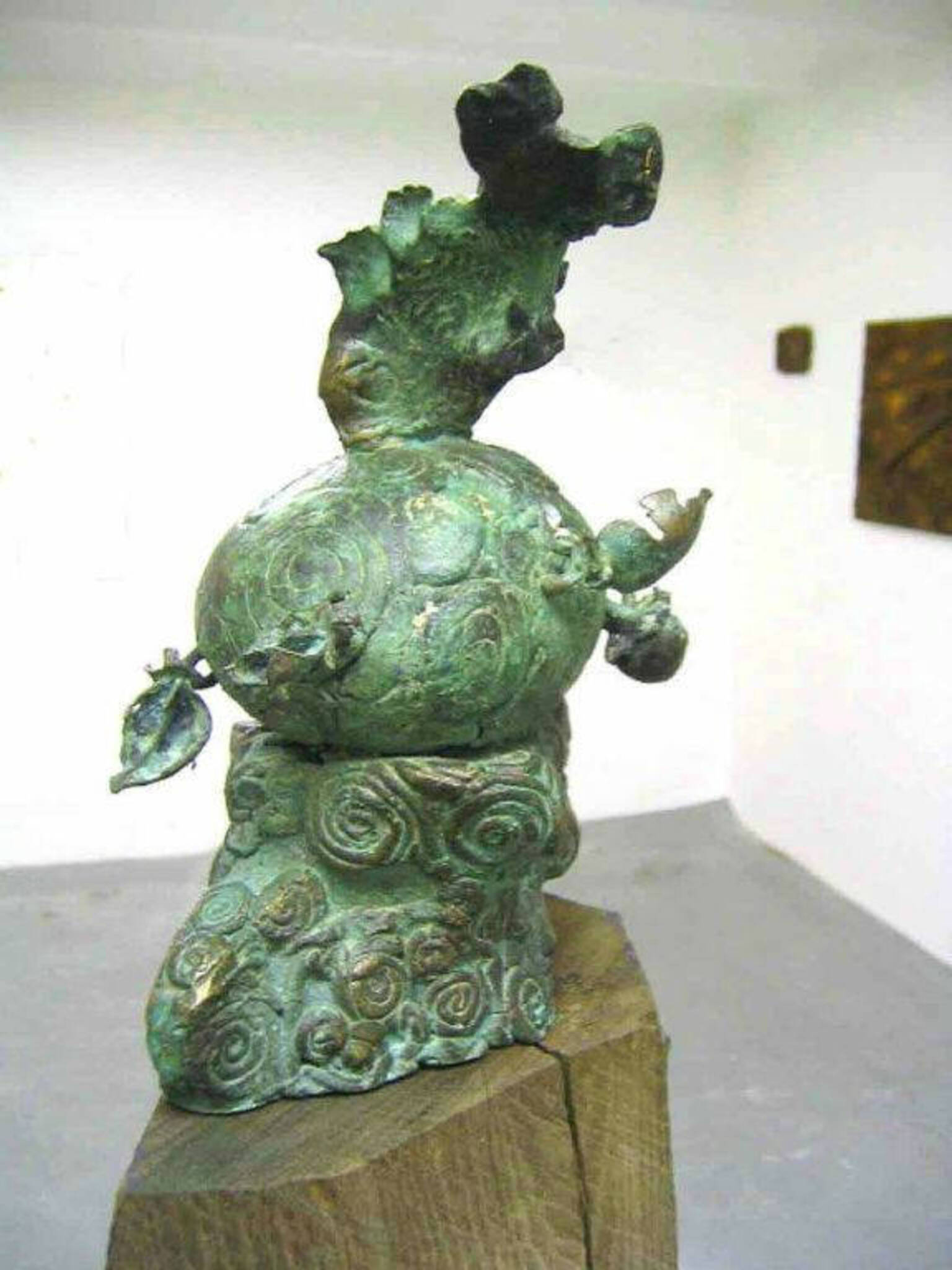 Een bronzen sculptuur dat balanceert tussen aards en spiritueel. De grillige vormen en symbolische details roepen een gevoel van beweging en harmonie op, alsof het zweeft in een tijdloze ruimte.