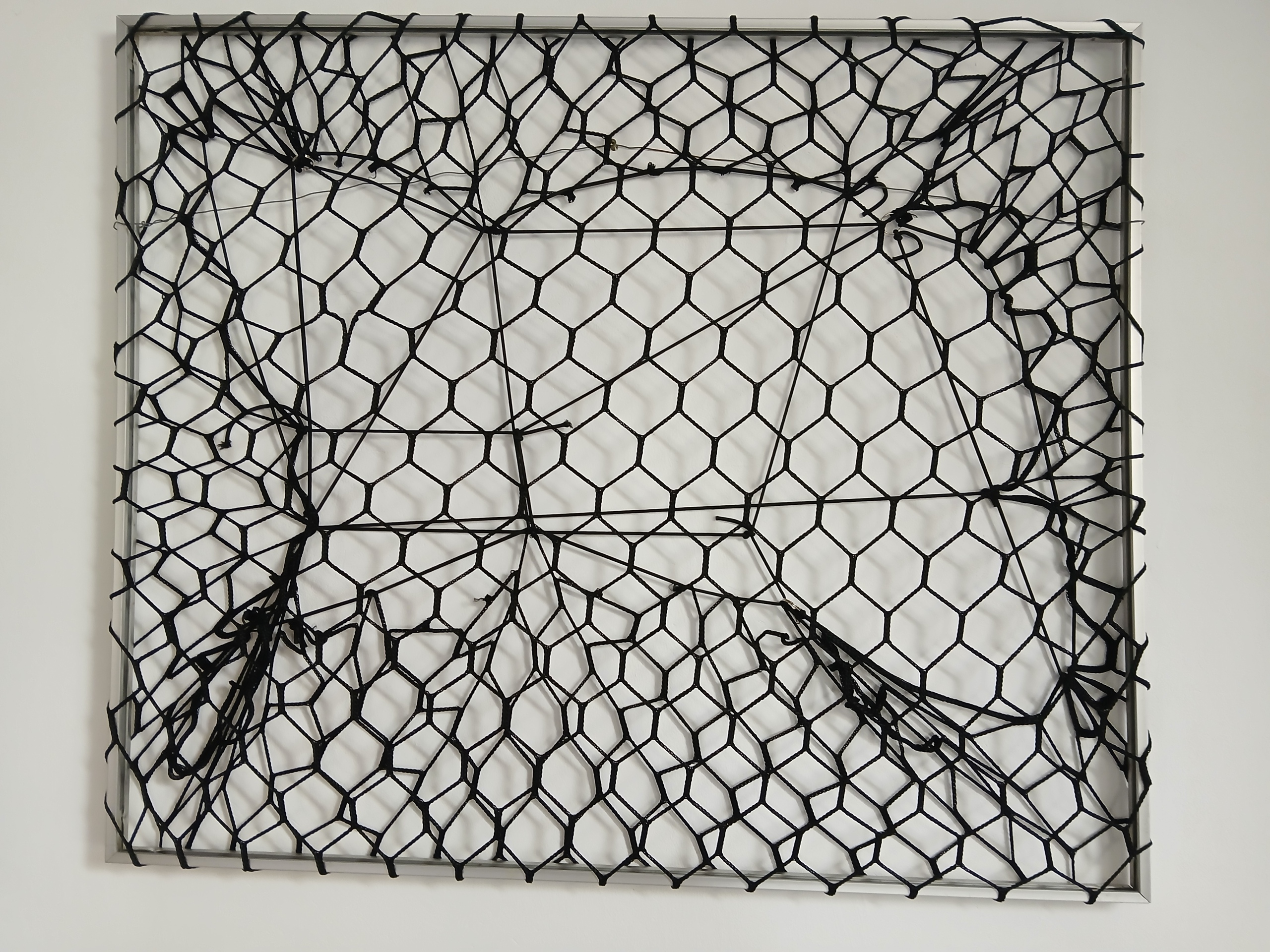 Abstract gevangen dier in metaal frame en zwart nylon draad.