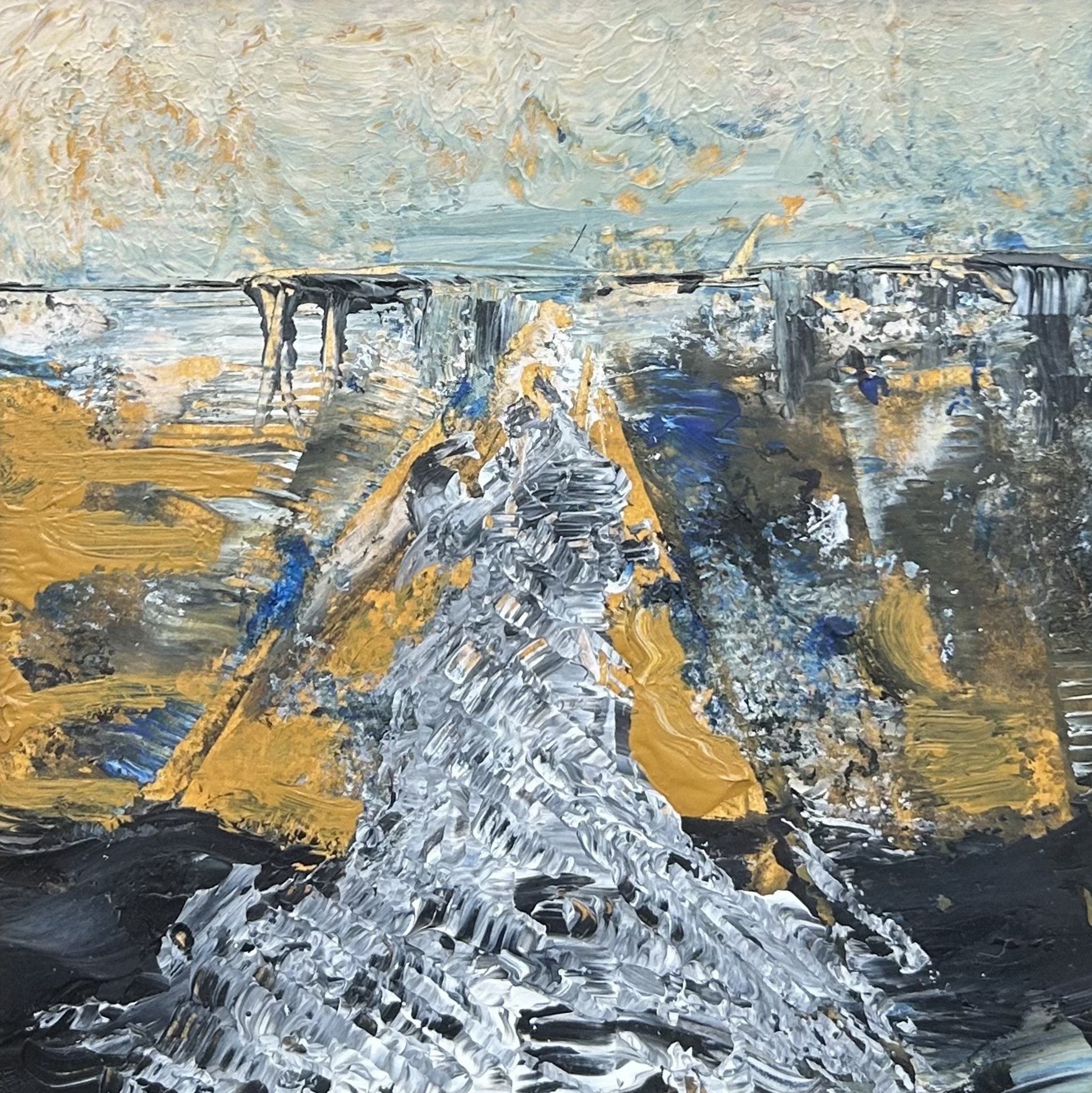 Ik schilder met acryl op doek met soms architectonische achtergronden. Met de menselijke figuren die ik erin aanbreng (geschilderd of als collage) probeer ik een verhaal te vertellen.