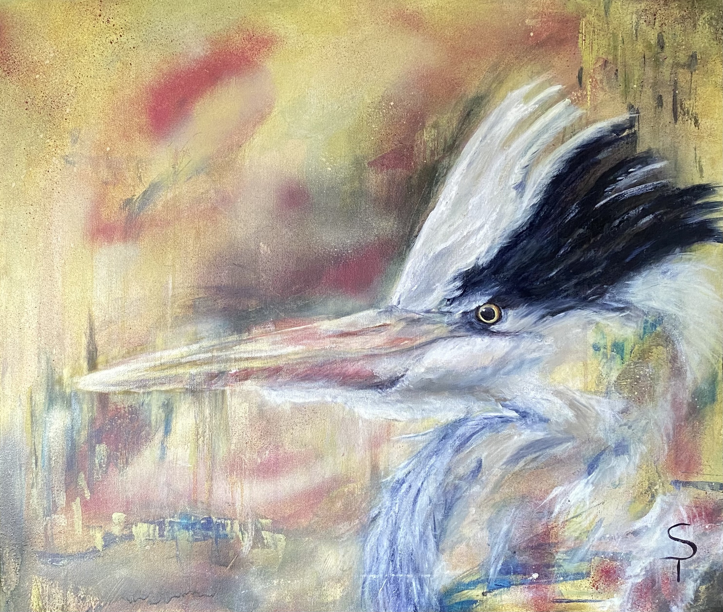 Realistische reiger in olieverf afgebeeld op een abstracte ondergrond in acrylverf