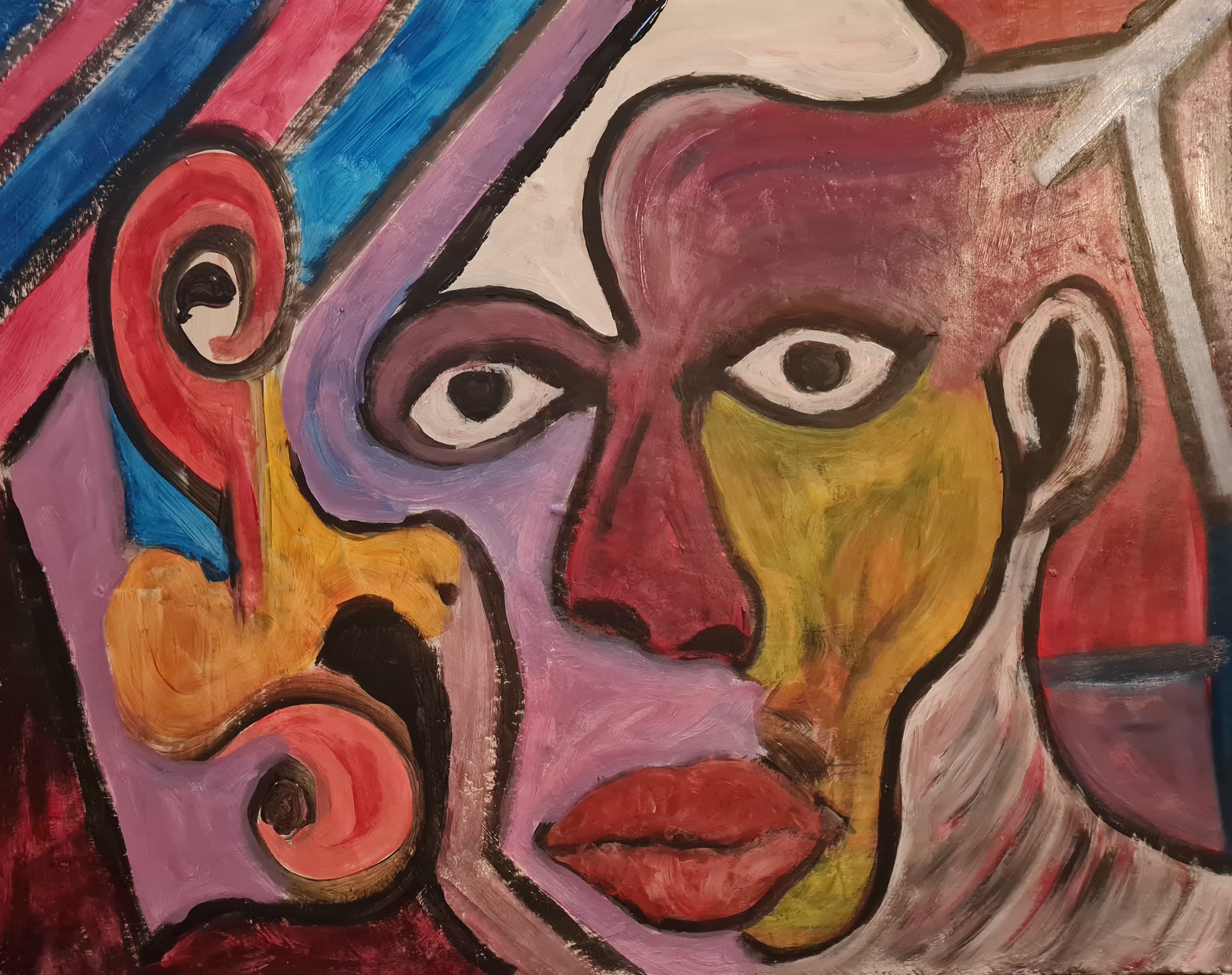 Het gezicht in het schilderij is niet zomaar een portret. Het is een weerspiegeling van een ziel gevangen tussen werelden. De scheve lijnen en contrasterende kleuren suggereren een botsing tussen emoties – woede, verdriet, vreugde, en berusting. Het ene oog kijkt helder en vol bewustzijn naar de kijker, terwijl het andere lijkt weg te glijden in een dromerige afwezigheid. Het is alsof het schilderij vraagt: "Ben jij compleet aanwezig in het leven, of dwaal je verloren in je gedachten?" De roodtinten in de achtergrond geven een gevoel van onrust en passie, terwijl het blauw en paars kalmte en spiritualiteit suggereren. De oren, uitvergroot en vervormd, symboliseren de noodzaak om te luisteren naar wat niet wordt gezegd – naar fluisteringen van de ziel, naar de stilte tussen de woorden.