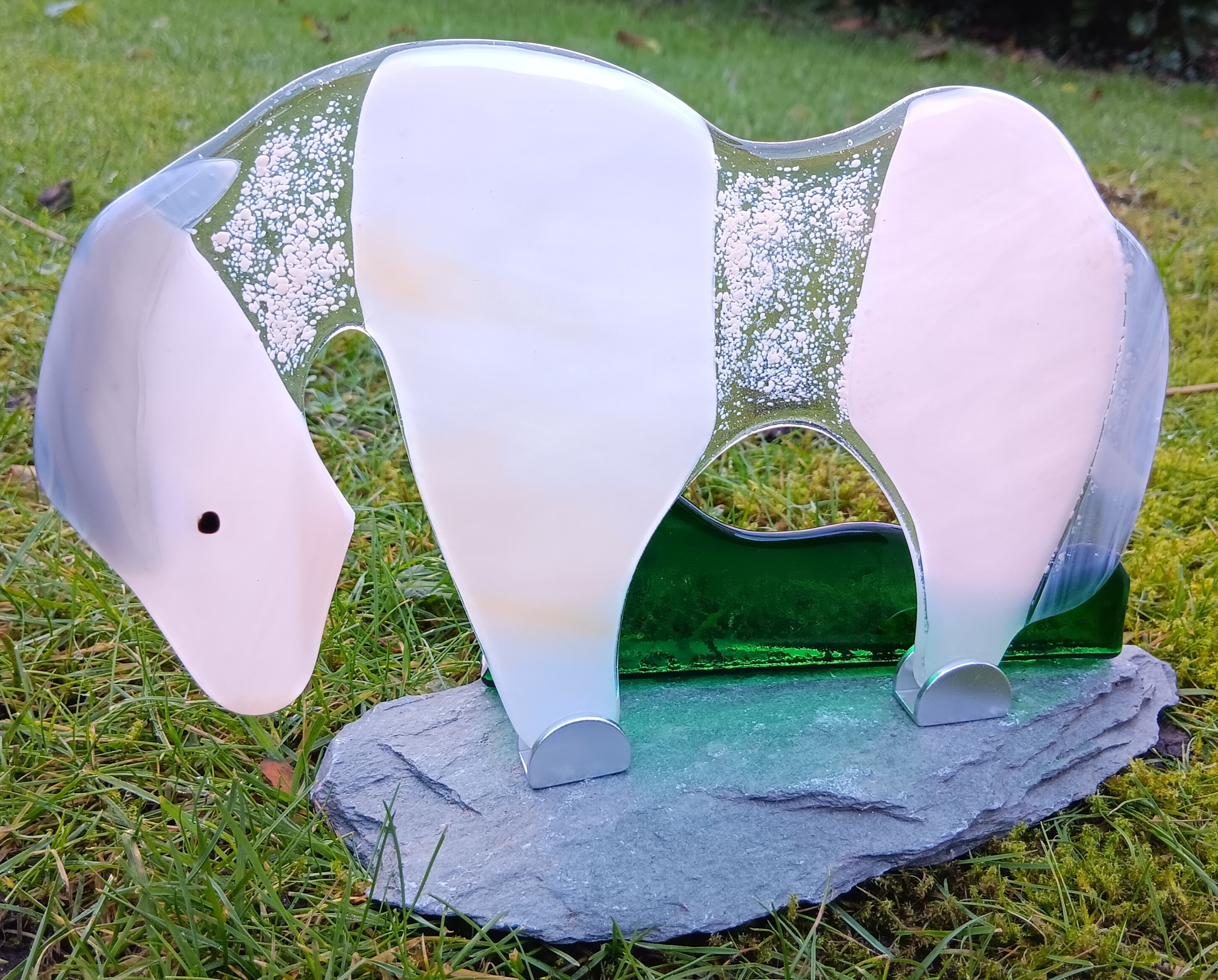 Glaswerk van Ed, diverse vormen en onderwerpen. Praktische expressie van onderwerpen in glas.