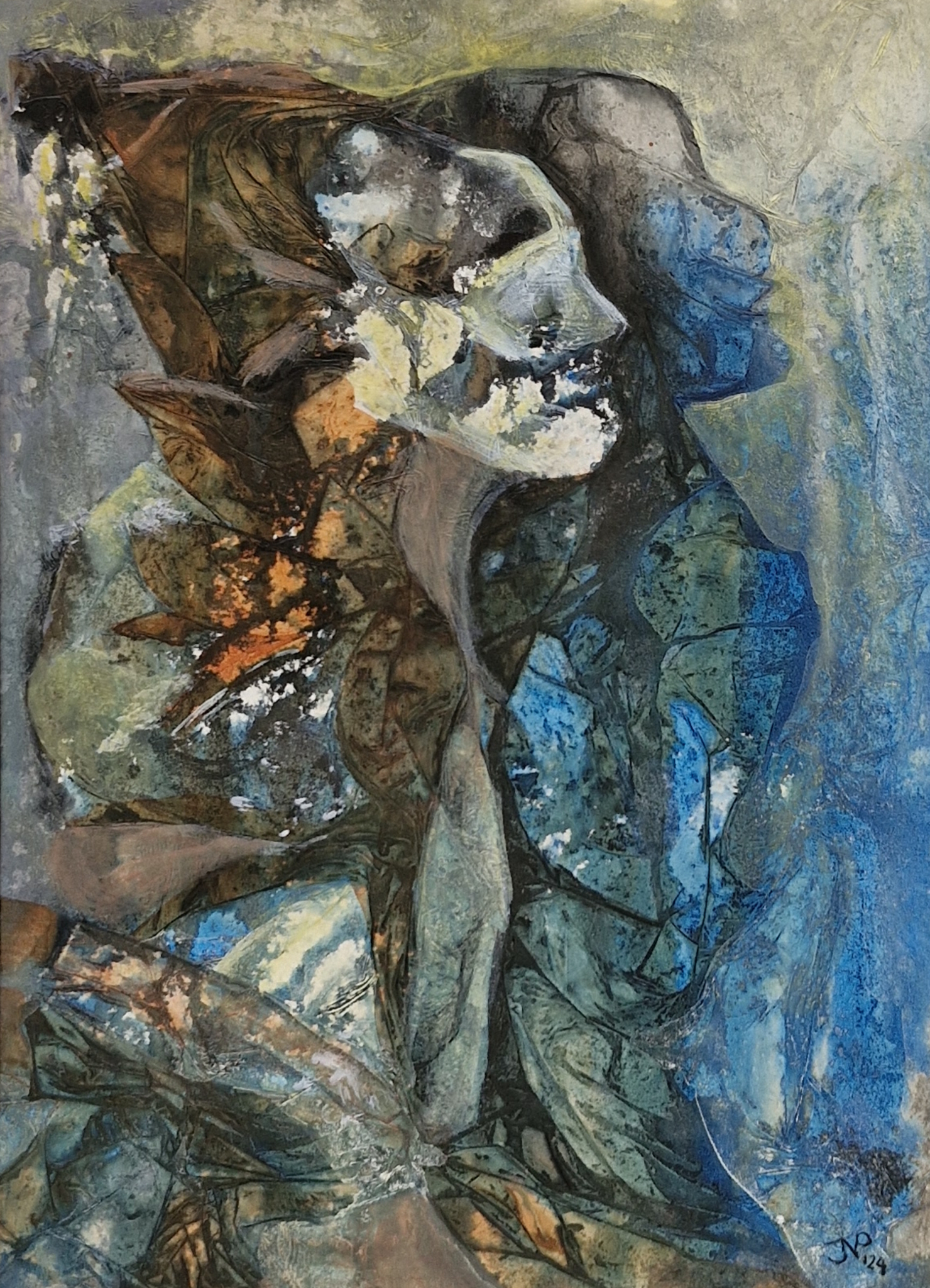 Twee fantasie figuren, waarvan één in de schaduw. Ontstaan vanuit intuïtief schilderen met gesso texturen en acrylinkt. De figuren zijn benadrukt door toevoeging van acrylverf. Het resultaat van onderzoek naar het werken met inkt. Wat opvalt zijn de organische vormen en donkere lijnen.
