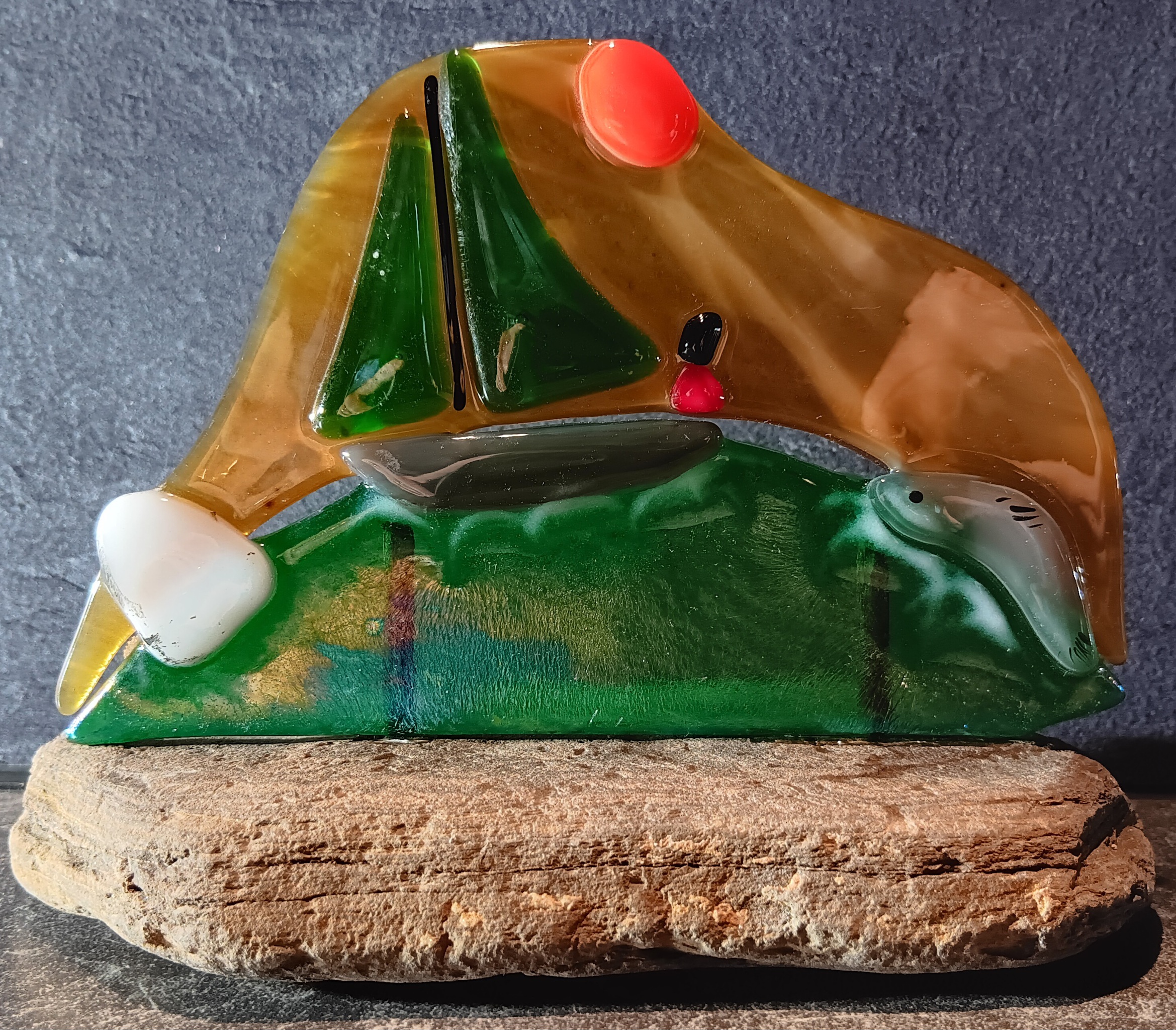 Glaswerk van Ed, diverse vormen en onderwerpen. Praktische expressie van onderwerpen in glas.