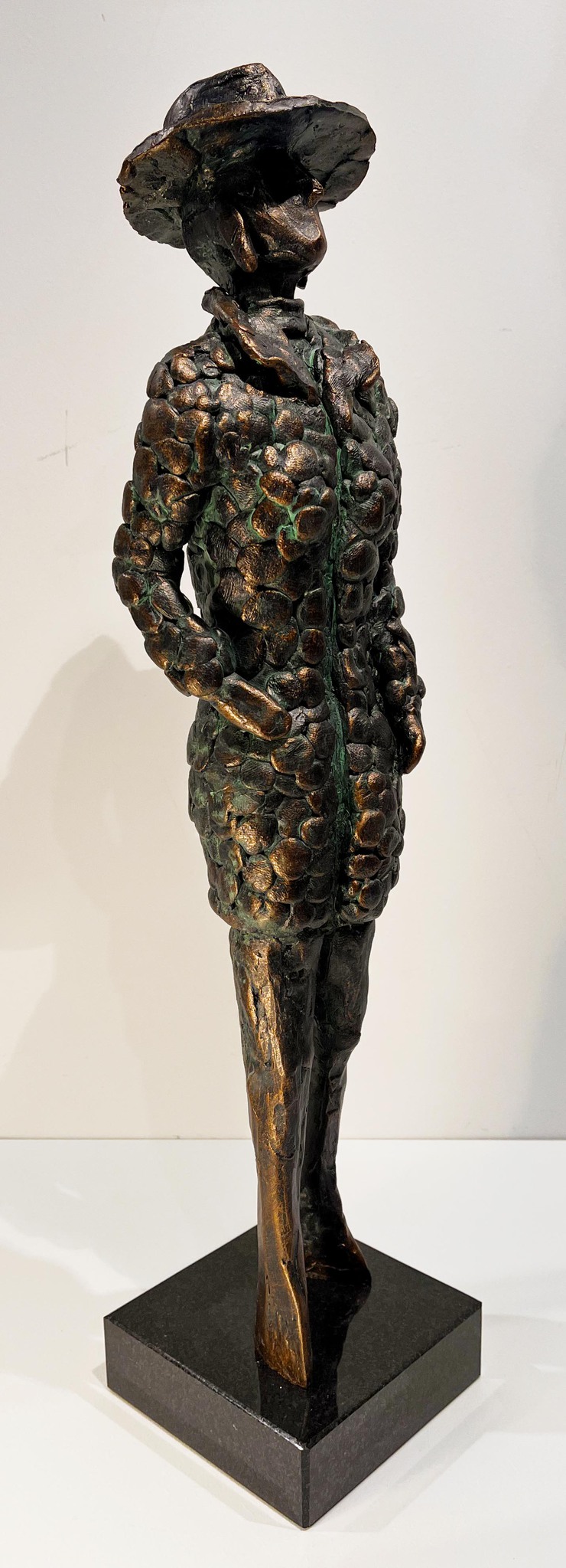 Zus, Slanke dame met hoed en modern gekleed met grote oorbellen beeld in Kunststof bronslook en zeegroen gepatineerd op hardstenen sokkel in kunststof bronslook