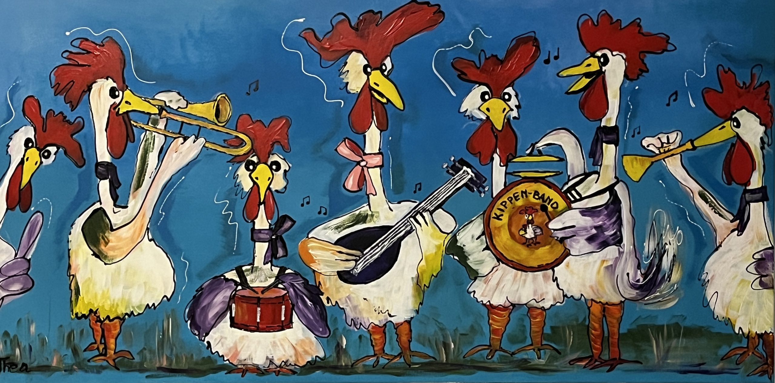 Deze vrolijke kippenband, is een acrylschilderij op canvas