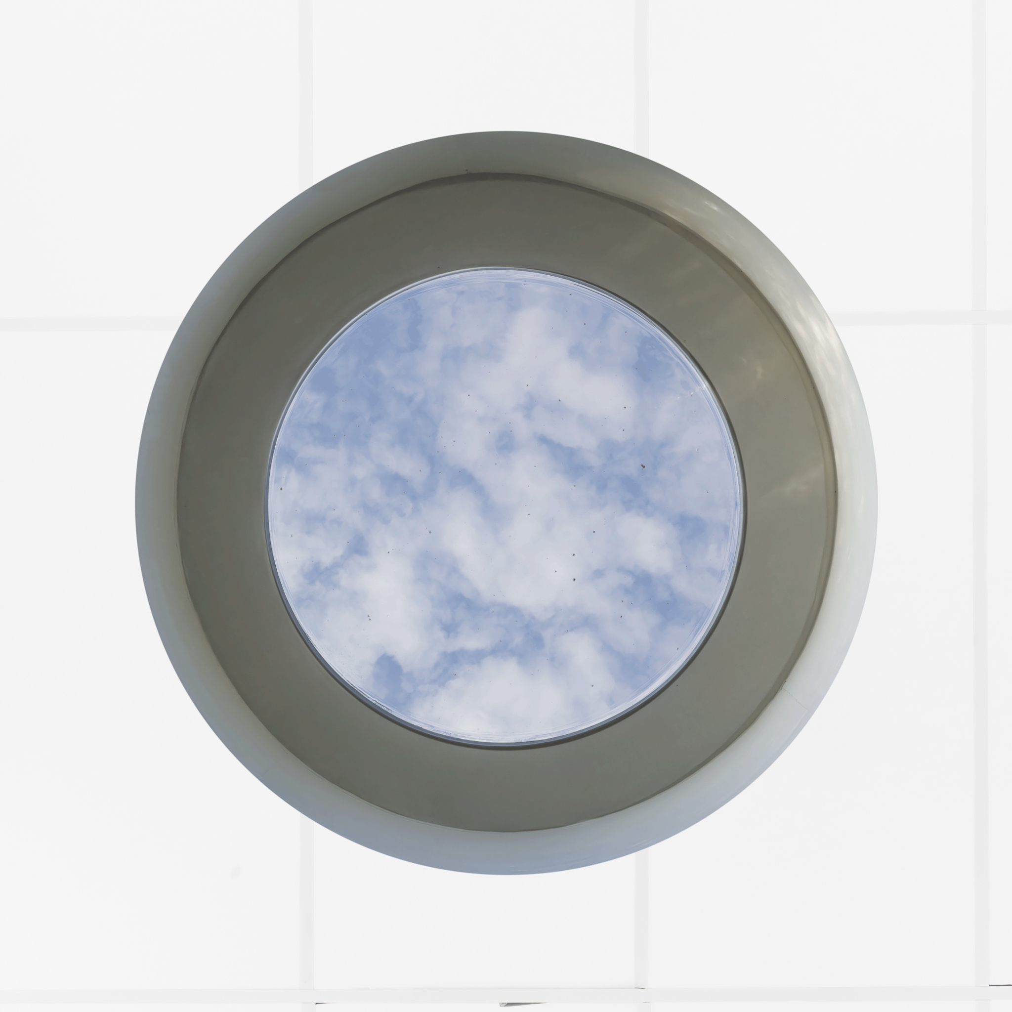 De foto’s zijn geinspireerd op een rond tapijt ontwerp van Bergoss. Geïnspireerd door Anish Kapoor en Jan Dibbets dacht ik aan een blauwe wolkenlucht, liefst met schapenwolkjes. Het resultaat bestaat uit een set van 2 foto’s genomen door een lichtkoepel: Een foto met daarop afgebeeld 6 series van 5 foto’s van de lucht genomen met het tijdstip van de opname eronder. Dit geeft een mooie indruk van de snelle weersveranderingen. Een foto van de lichtkoepel met een van de luchten op ware grootte afgedrukt, bevestigd tegen het plafond. Later heb ik ook nog een buitenfoto gemaakt zoals ik oorspronkelijke van plan was, een gespiegelde blauwe lucht op een groen grasveld Complementaire kleuren: Gaandeweg realiseerde ik mij dat het blauw in de lucht eigenlijk de complementaire kleur is van het oranje bruin in het tapijtontwerp. Alsof de lucht het (analoge) kleurnegatief is van de foto van het origineel ontwerp. Aardse kleuren van het tapijt vs de hemelse kleuren van de lucht.
