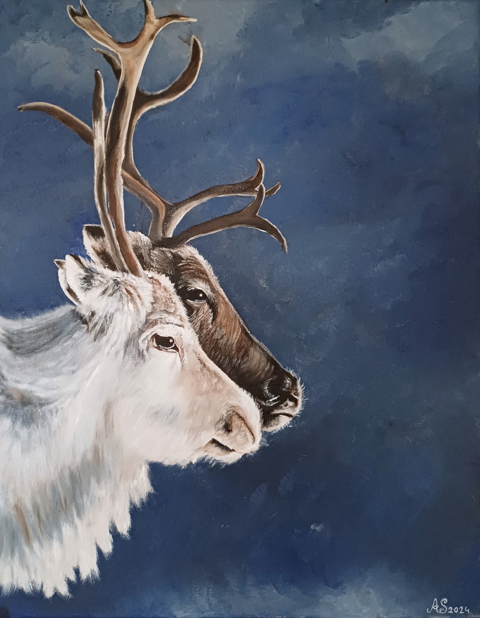 Rendieren geschilderd in olieverf op canvas. Afmetingen 40x50 cm. Dit werk is de eerste in een serie van drie. Mijn inspiratie komt van het Hoge Noorden, een televisieserie waarin o.a. Noorwegen wordt bezocht, waar de rendieren nog vrij rond lopen. Op een koele blauwe lucht geven deze zachte rendieren mij toch een warme energie.