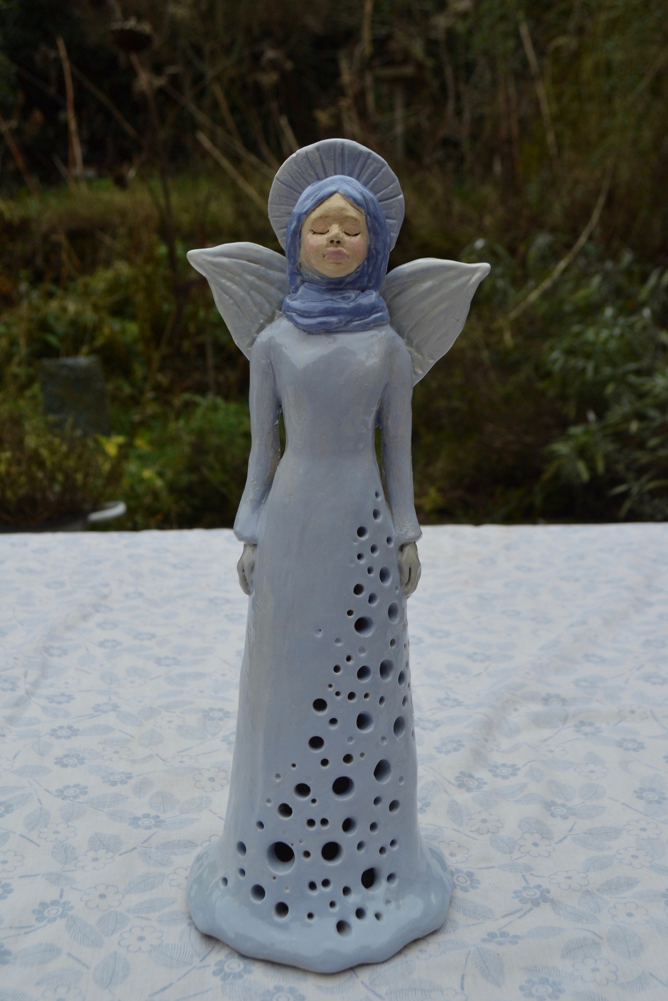 Engel van aardewerk, met blauw glazuur beschilderd, verlichting met een theelichtje.