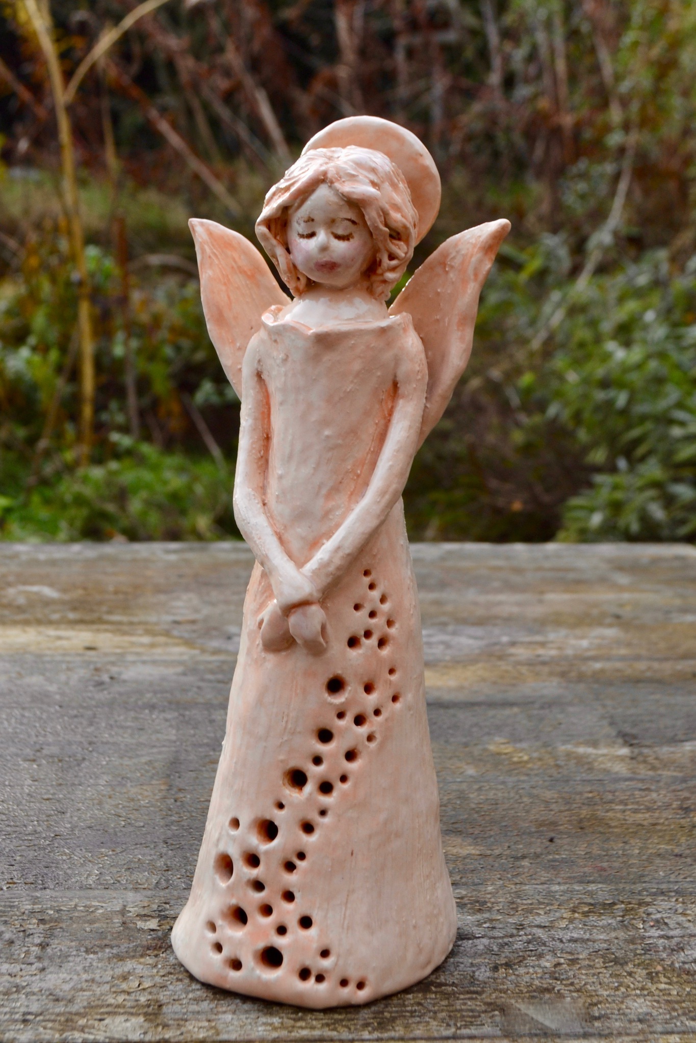 Engeltje van aardewerk met verlichte rok.
