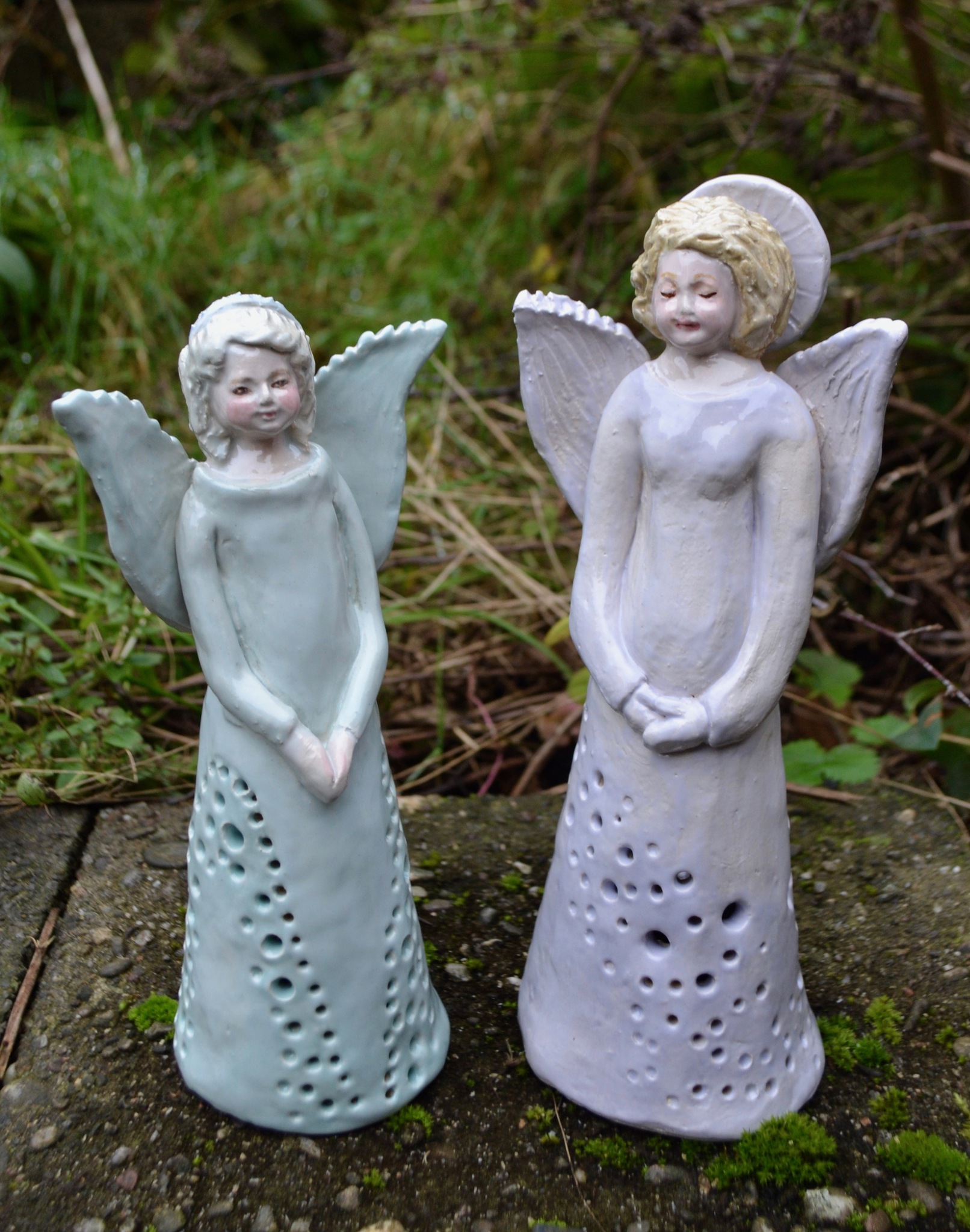 Twee engeltjes van aardewerk in licht paars en groen geglazuurd.