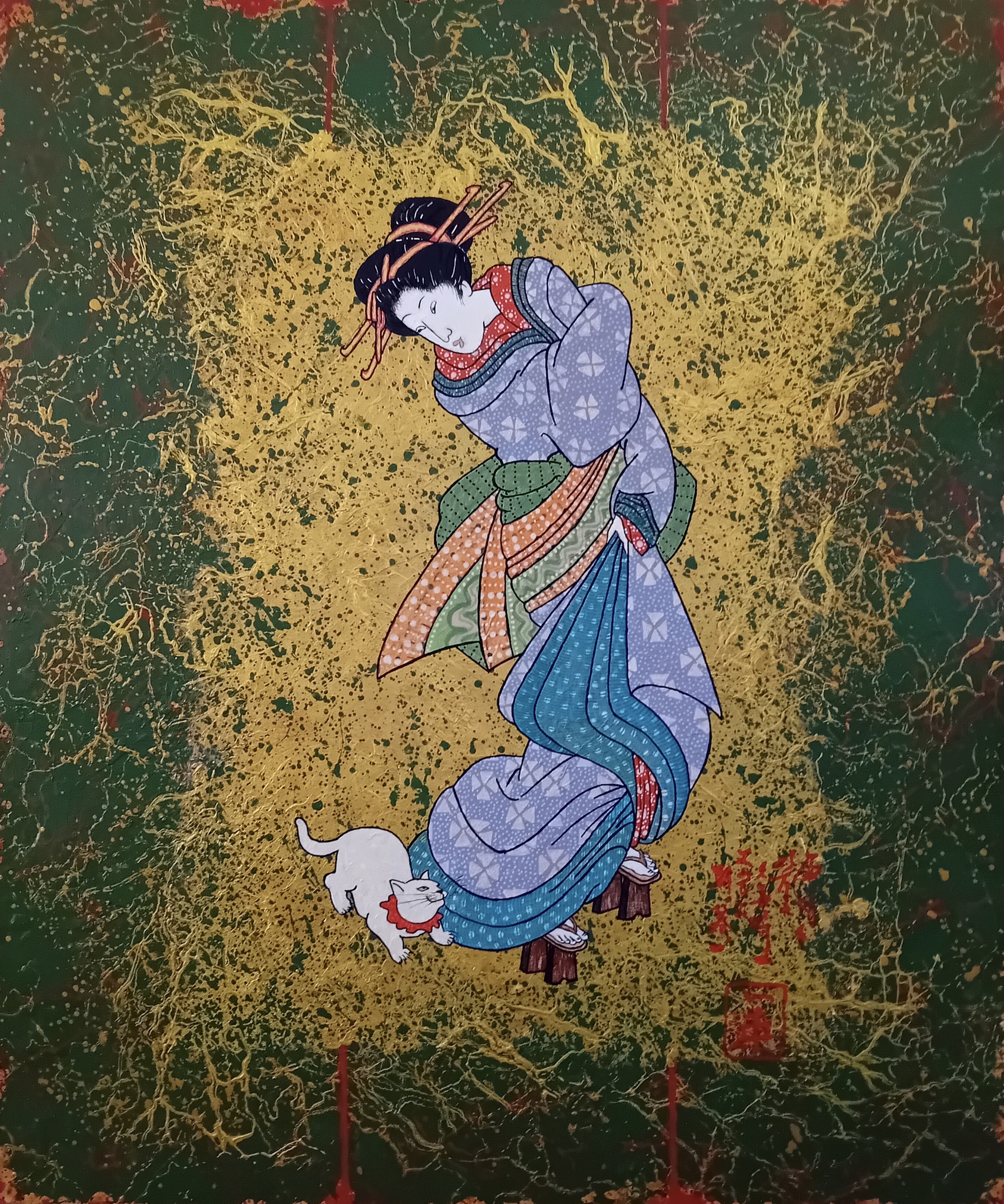 Geisha wordt verrast door kat. Acryl op paneel. Sold.