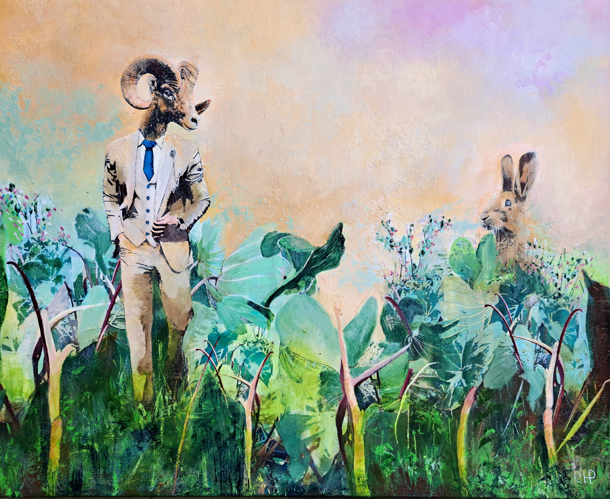 Een schilderij van een geit die blij verrast is dat het konijn hem ziet, Net nu hij zijn mooiste pak had aangetrokken. Klaar om direct op te hangen. onderwerp: geit, konijn. pak, jungle, groen, botanisch, natuur, plant, humor, fantasie, landschap, natuur,