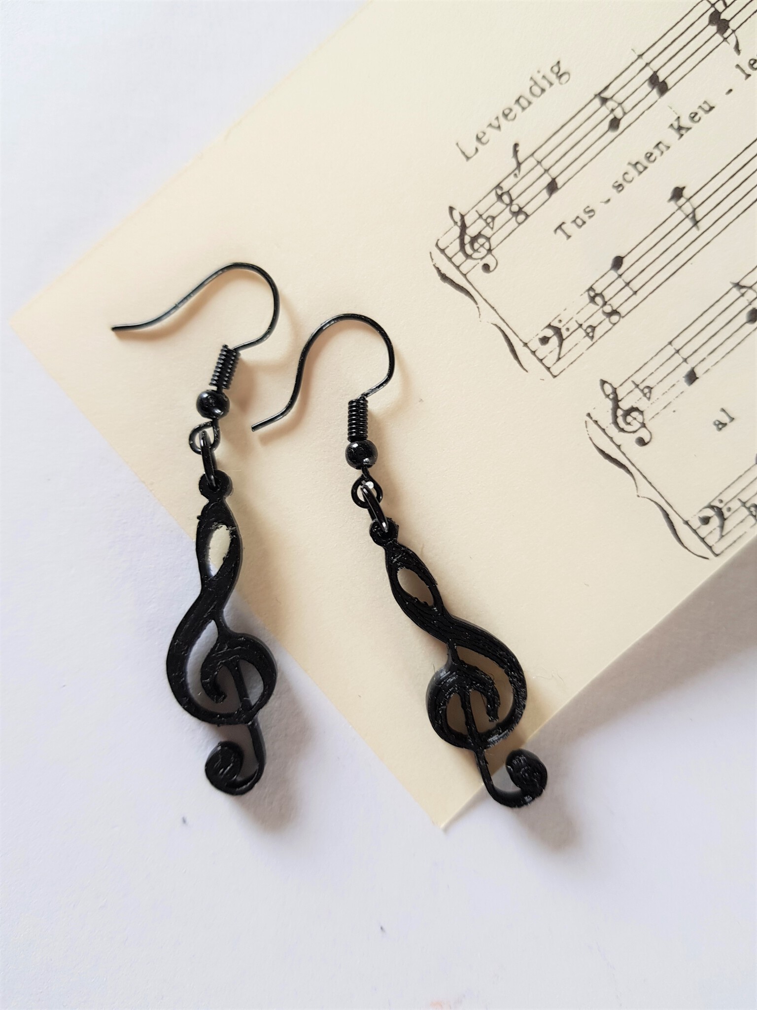 Handgemaakte oorbellen met liefde voor muziek. En elk stukje is met liefde gemaakt. Een mooie G-sleutel in zwart. Uniek. Hoe mooi. voor muziek-lovers, en tattoo cadeau voor musici. De oorbellen zijn handgemaakt door mij middels het 3D proces van bio-afbreekbaar filament. Het is een eigen ontwerp. In Corona-tijd kocht ik een 3D-printer en schreef hier een blogpost over op Wordpress. (madebymirjamblog) Een mooie symbolische gift. Al mijn juweeltjes worden verpakt in een handgemaakt zakje. De Muziek oorbelletjes zijn ongeveer 5/6 cm lang, ze wegen haast niets, dus je zult geen oorstress hebben.