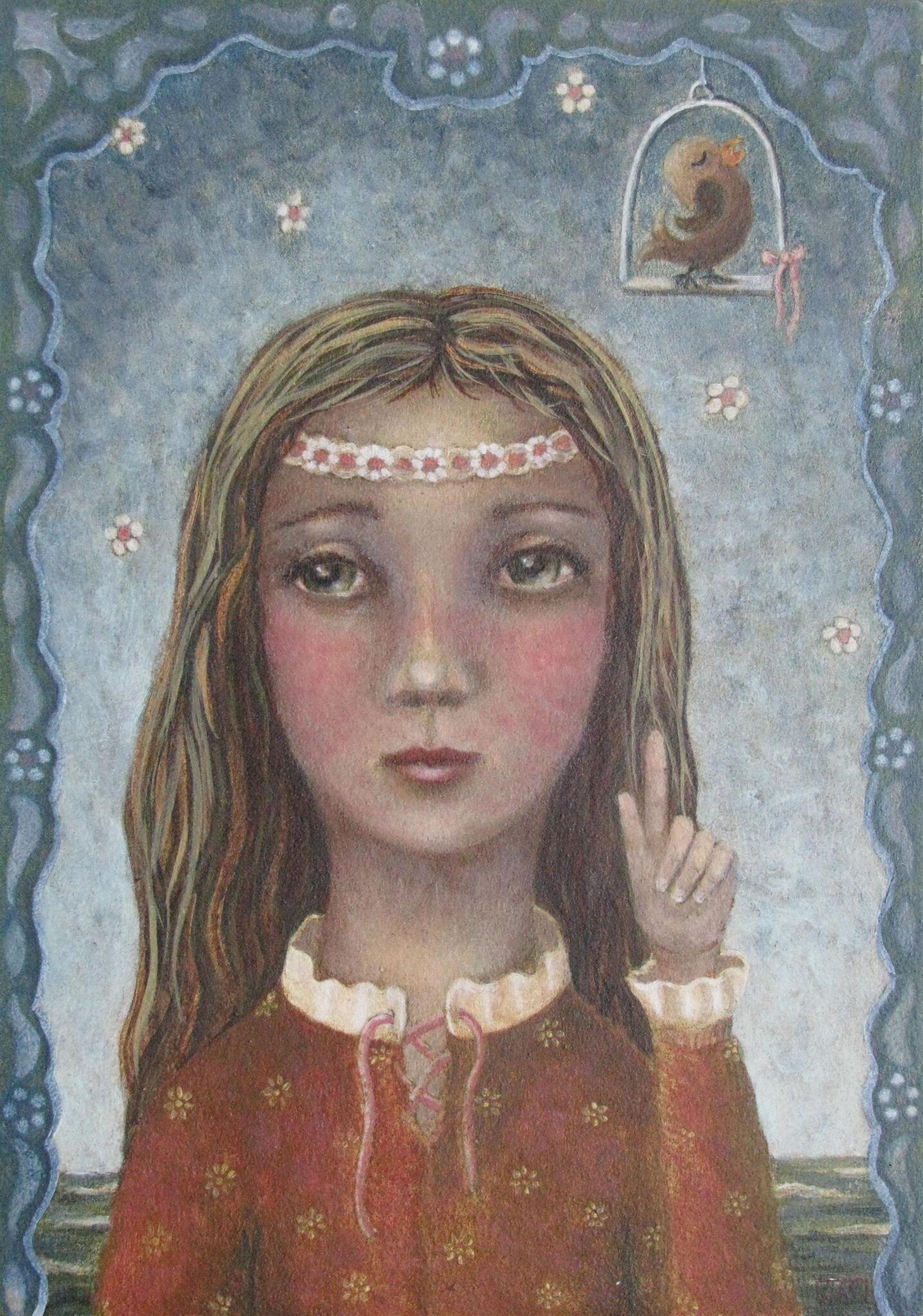 Meisje Zee Rood Blauw Vogel Bruin Vinger Zingen Wijzen