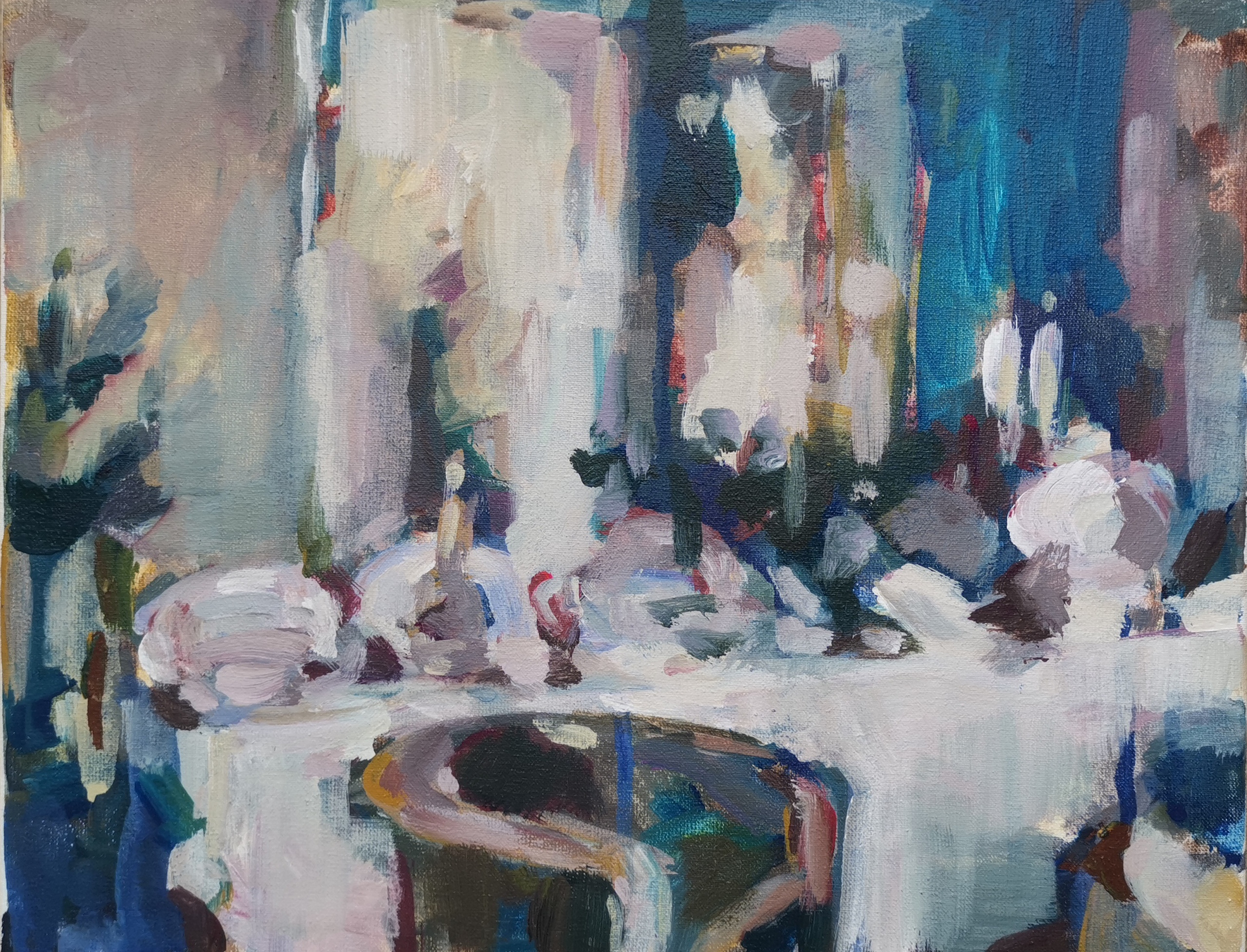 Van binnen naar buiten kijken staat centraal. Daarbij een focus op het verkennen van de diepte van kleur en de kunst van het expressief vastleggen van licht op doek.