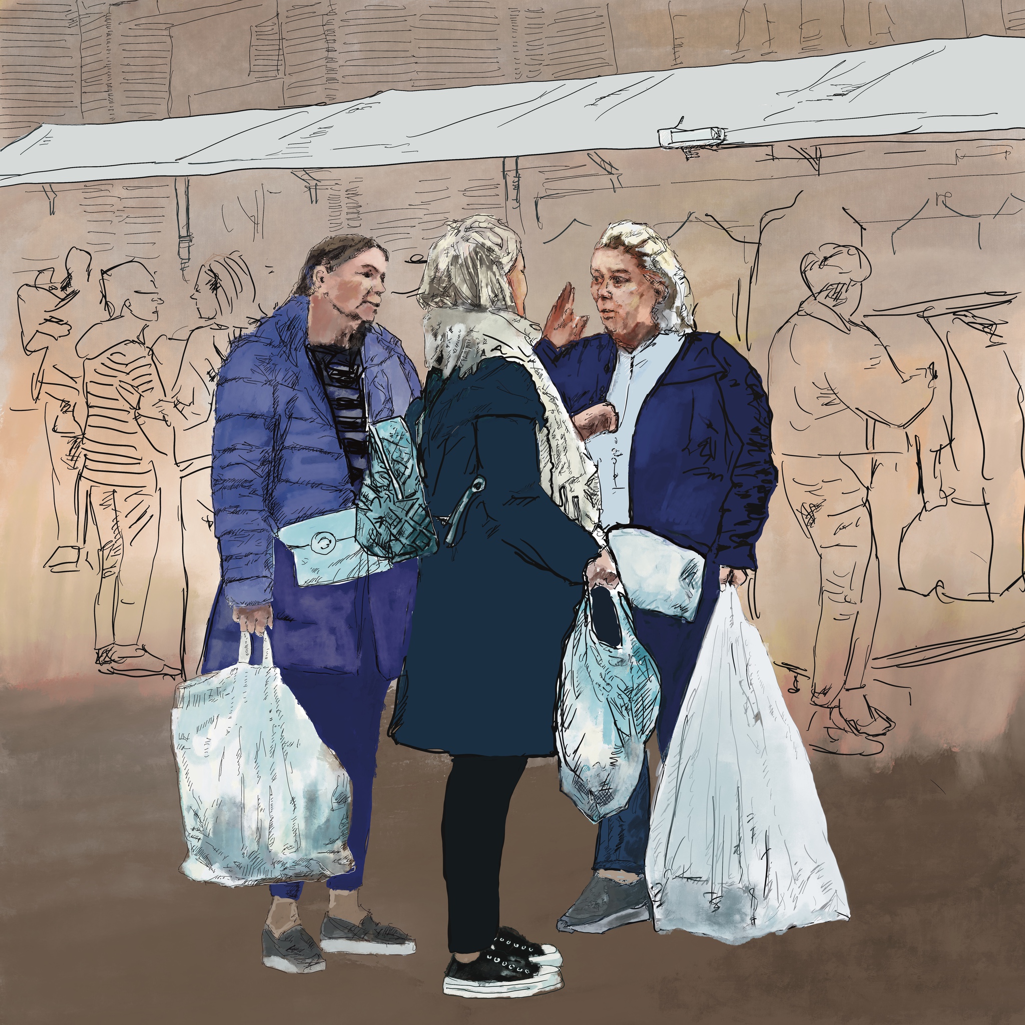 Lappendag. 'S ochtends om 8 uur. Groepjes op,zoek naar koopjes gewapend met plastic zakken die al goed gevuld zijn.