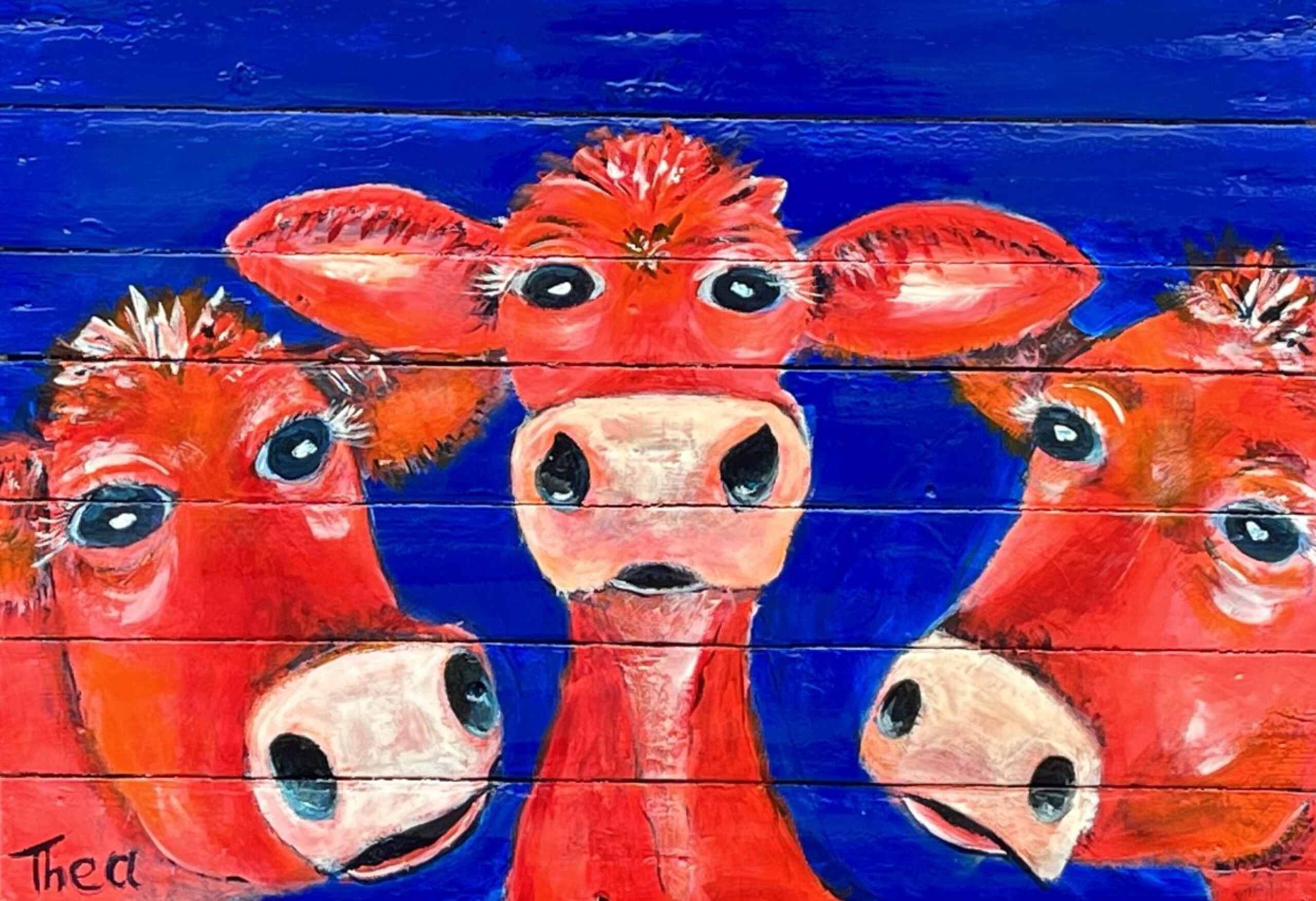 Vrolijke koeien op een pallet. Met acryl en afgewerkt met lak. Voor buiten.