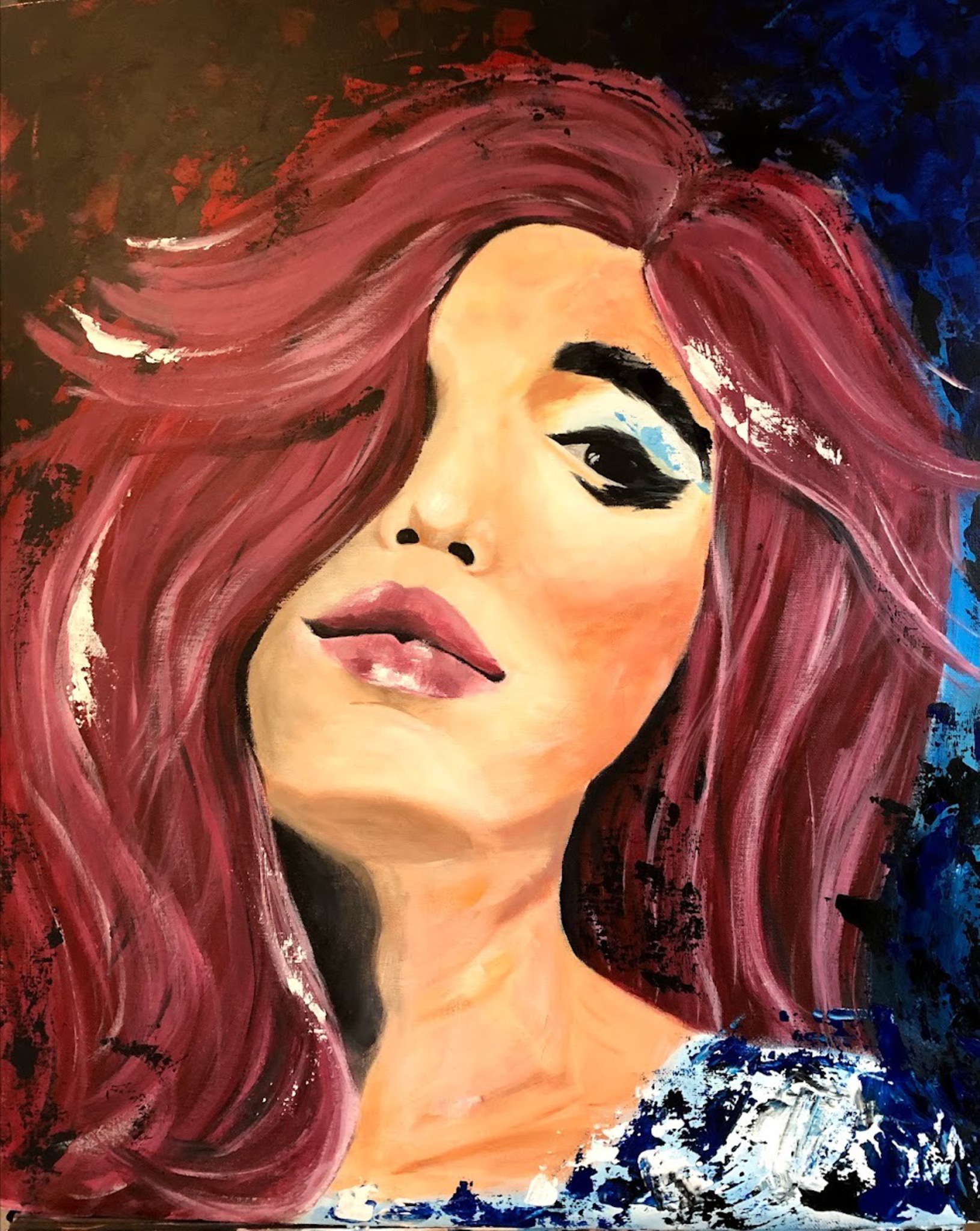 Dit expressieve portret, genaamd Red, straalt kracht en mysterie uit. Het levendige rode haar en de contrasterende kleuren op de achtergrond versterken de intense blik en zelfverzekerde houding van het model. Inclusief lijst