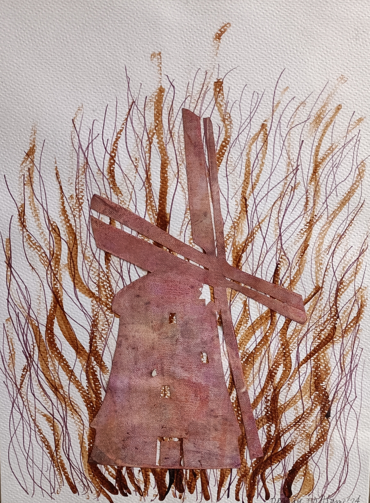 UItsnede van een molen met op de achtergrond getekende lijnen in sepia